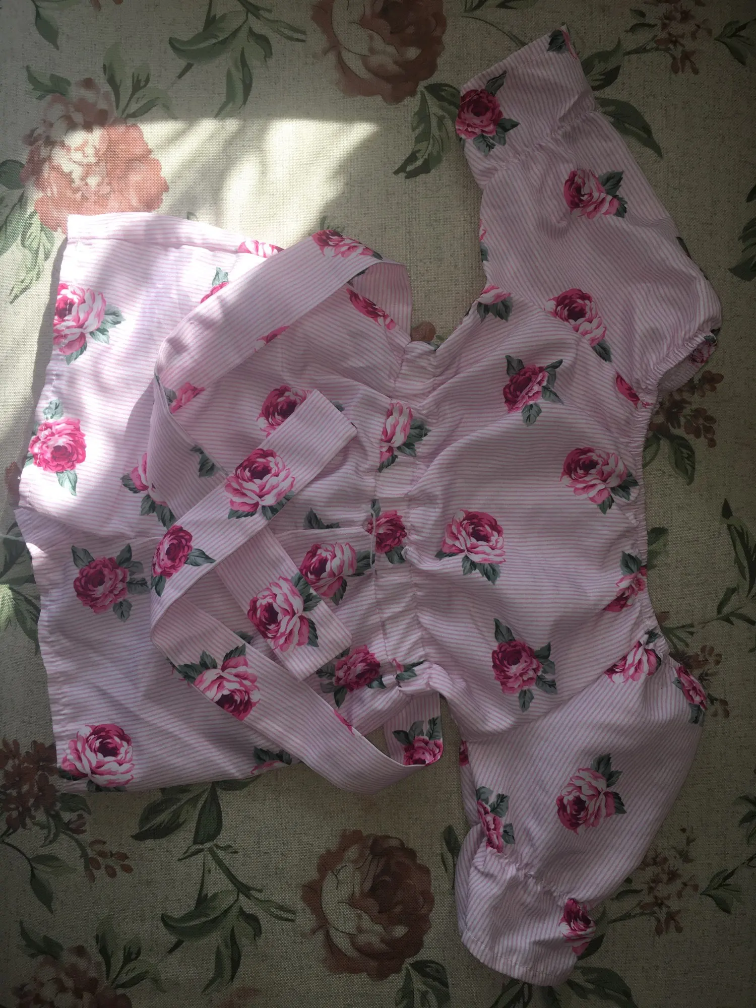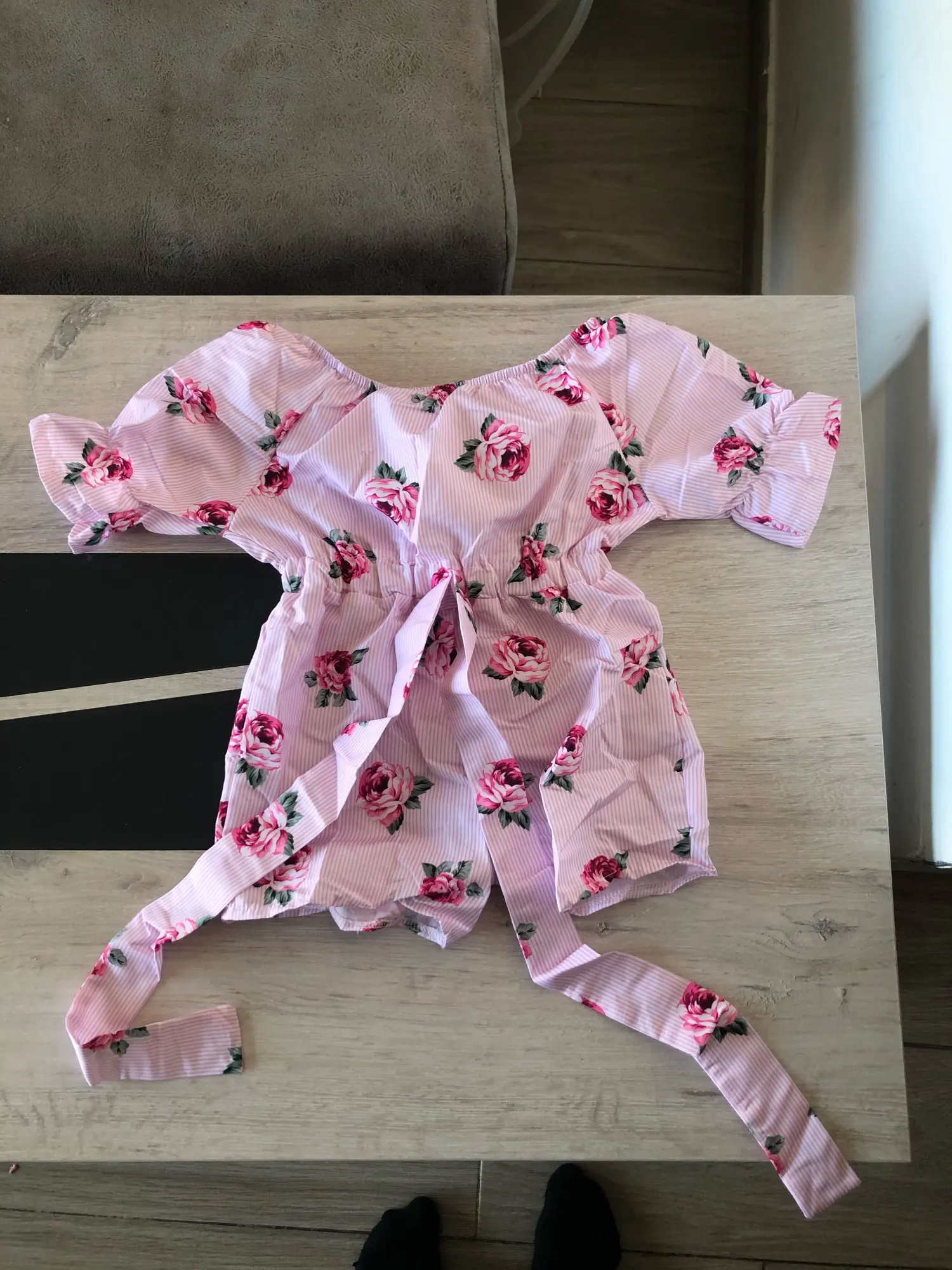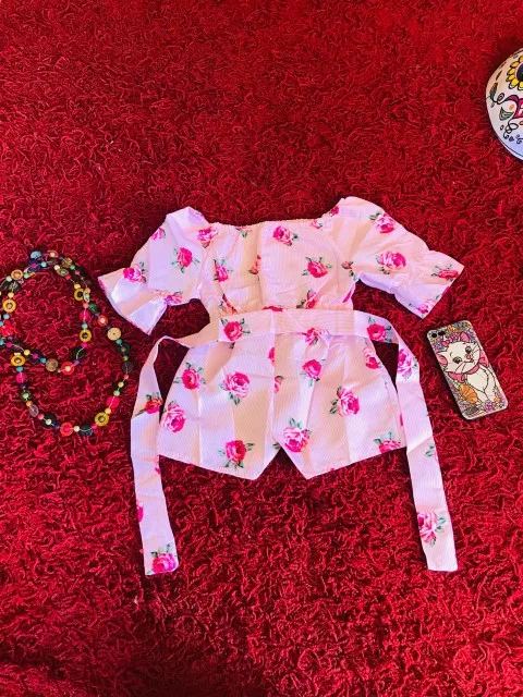 Можно встретить неровные шовчики и торчащие ниточки. Комбез очень маломерит. Для дочки ростом 100см заказала размер 4Т, сел очень впритык. Запаса ноль, да и сейчас некомфортно сидит по росту. Очень жаль. Ткань хлопковая, не тянется. Яркий и красивый принт. Комбинезон без молнии, застежек и пуговиц, одевается снизу вверх, через шортики. Плечики можно опускать или поднимать, кому как нравится. Есть пришитый поясок. Если решили заказать , то советую взять вам не на размер, а на два-три больше. Нам, к сожалению, комбинезон не пригодится, так как маленький