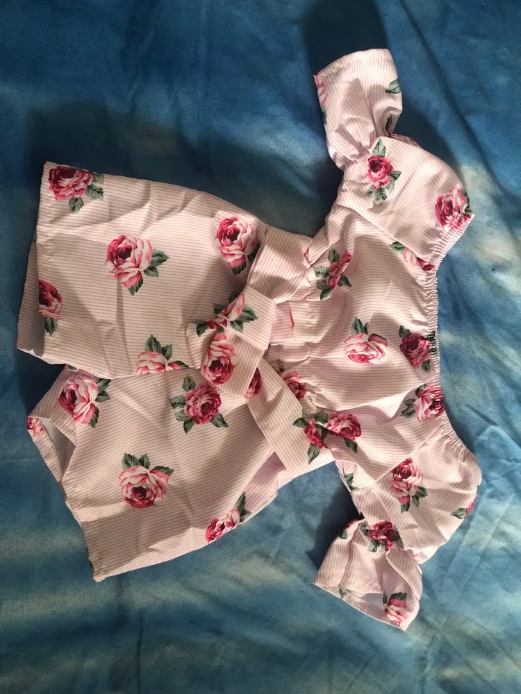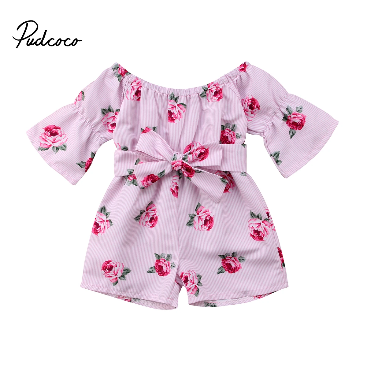 Комбинезон детский, с цветочным принтом, с открытыми плечами и расклешенными рукавами, полосатый, 2019