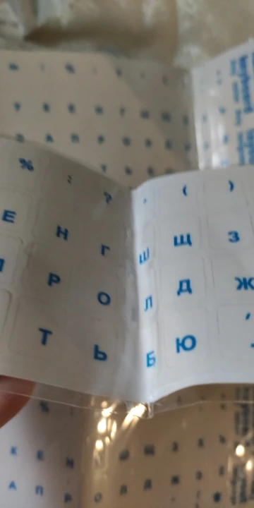 Наклейки отличные. Не помялись во время транспортировки. Клеятся хорошо. Только выбранный цвет, голубой, не подошел к цвету клавиатуры. Она черная. Букв совсем не видно. Голубой не "ядерного" оттенка, а более естественного. По этому сливаются цвета. Для черной клавиатуры берите лучше красный. Продавца и товар рекомендую
