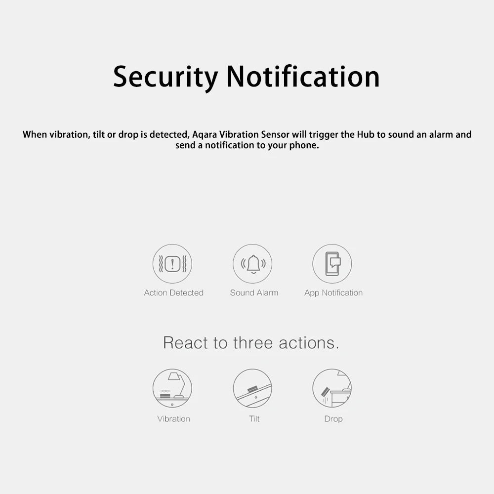 При обнаружении вибрации, наклона или падения датчик вибрации Aqara вызовет концентратор, чтобы звуковой сигнал и Отправьте уведомление на ваш телефон.