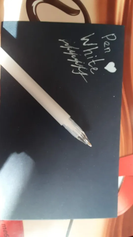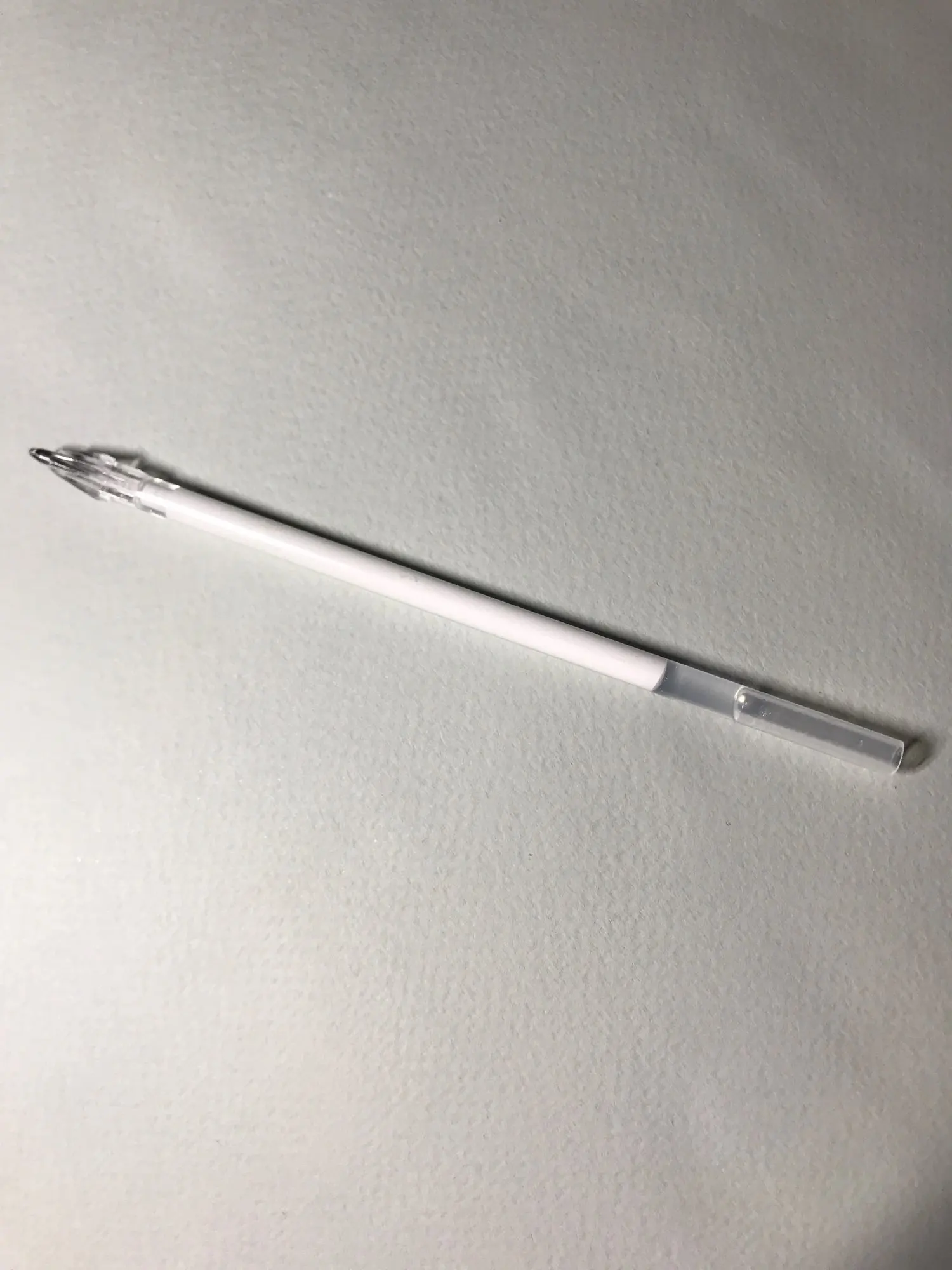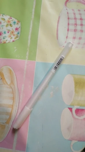 Stylo qui écrit blanc. Pointe de bonne qualité, bon débit de blanc. Il faut 2/3 couches mais dans l'ensemble, pas déçue du tout.