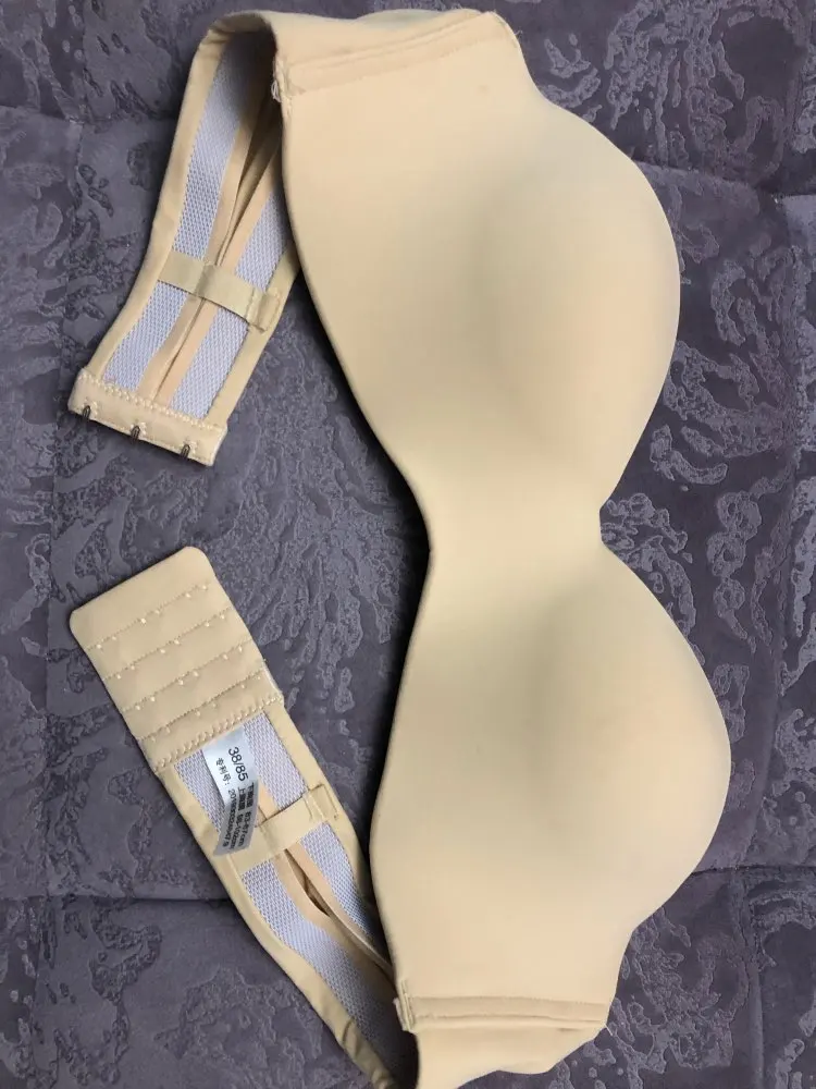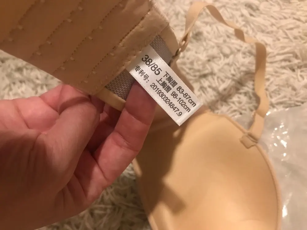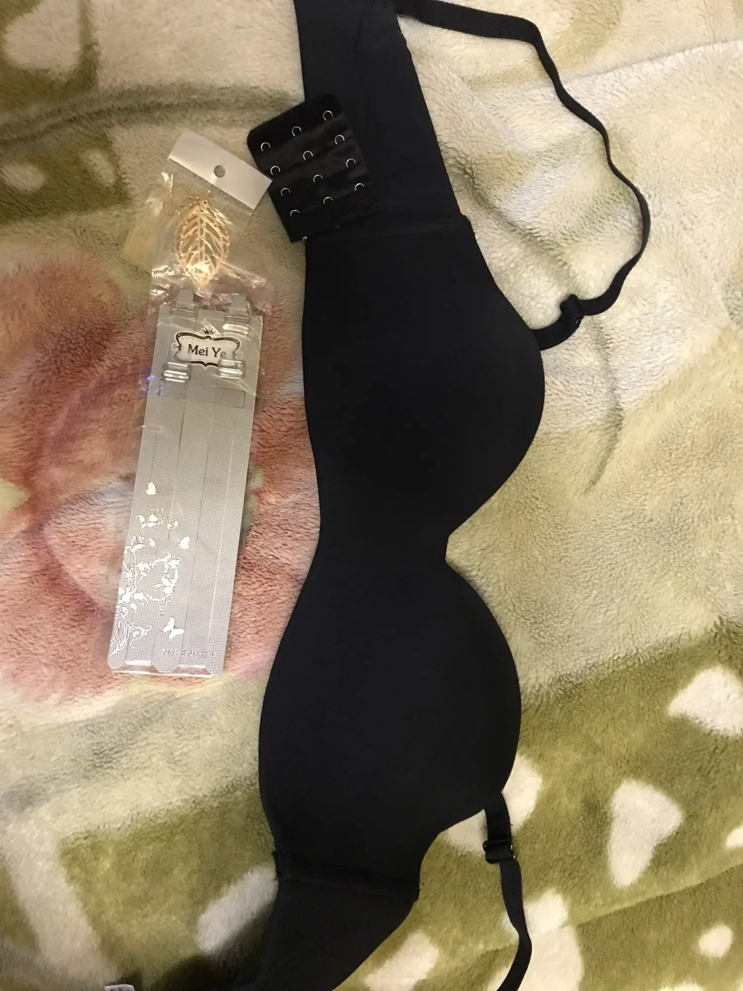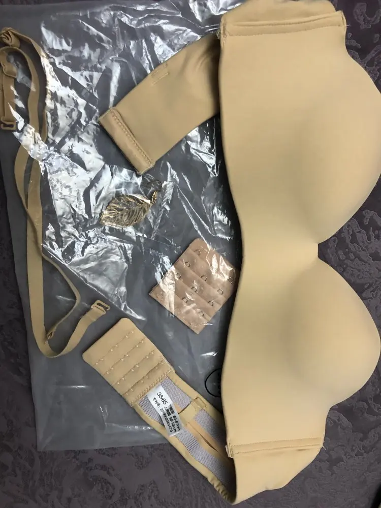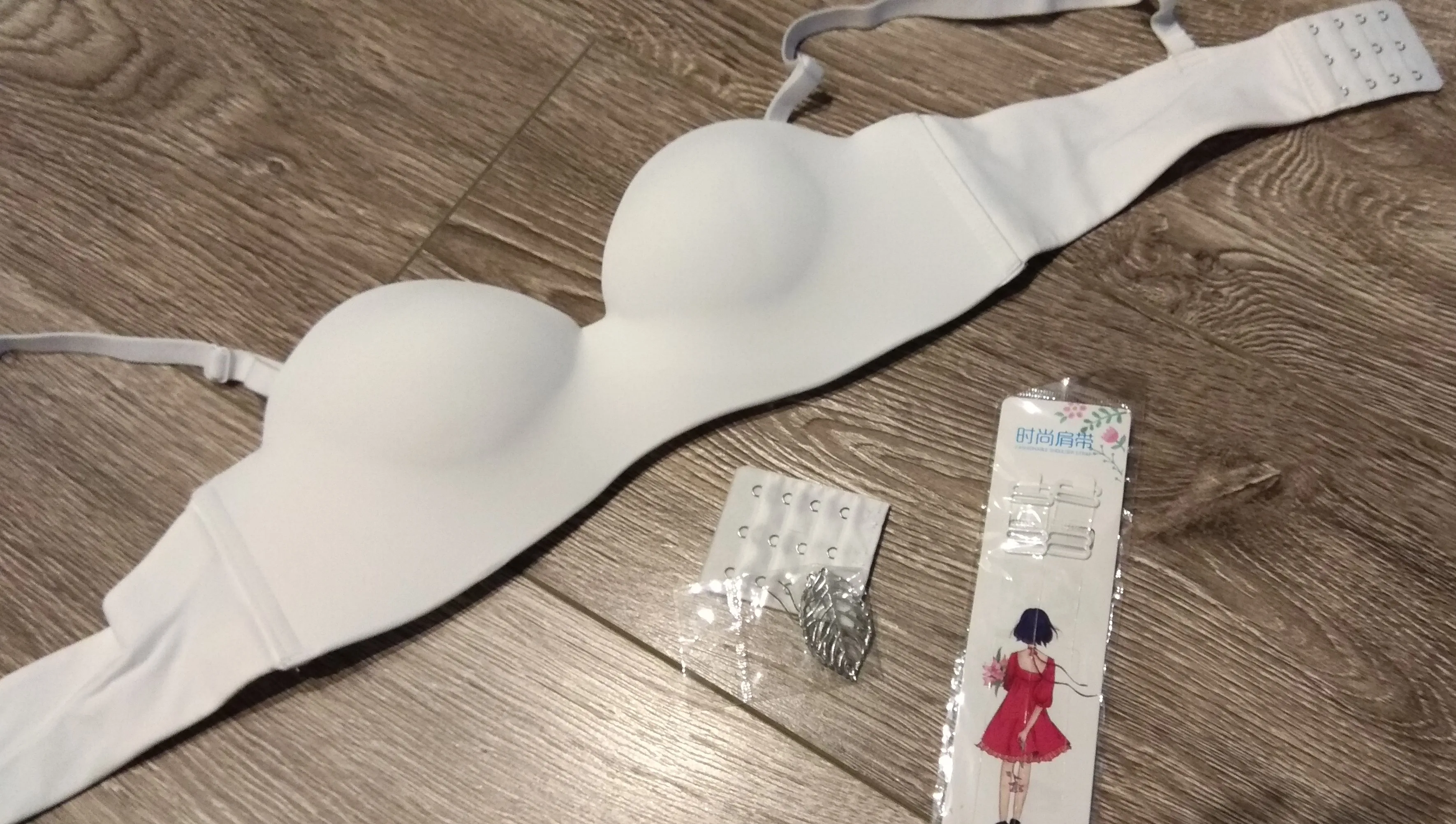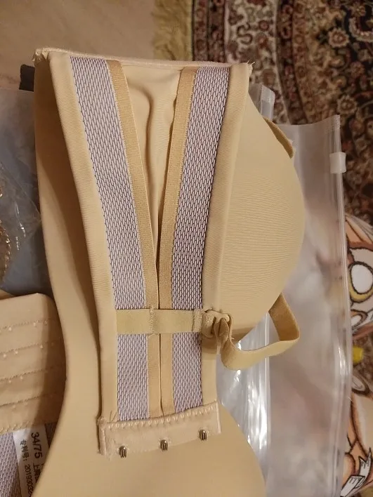 Мои параметры под грудью 75, грудь 84-85, широко расставлена, ношу 75б, такой и взяла. Застегнулся на первую из четырёх линию крючков. Сидит хорошо, жаль только, что нет силиконовой держателя вдоль нижнего шва, как на похожих бюстах от тезенис, а так один в один. Держится на груди без лямок. А вот сами лямки коротковаты, если их надеть, начинает расплющивать грудь и она вылезает из чашек как опара. Длина лямки 37 см. Буду носить без них. В комплекте расширитель, прозрачные лямки и сережки листики. Мне достался за 200 с чем-то рублей с купонами. Удивительно, что даже лямки не выглядят дешманскими, как это бывает у китайских изделий. Оч хорошо