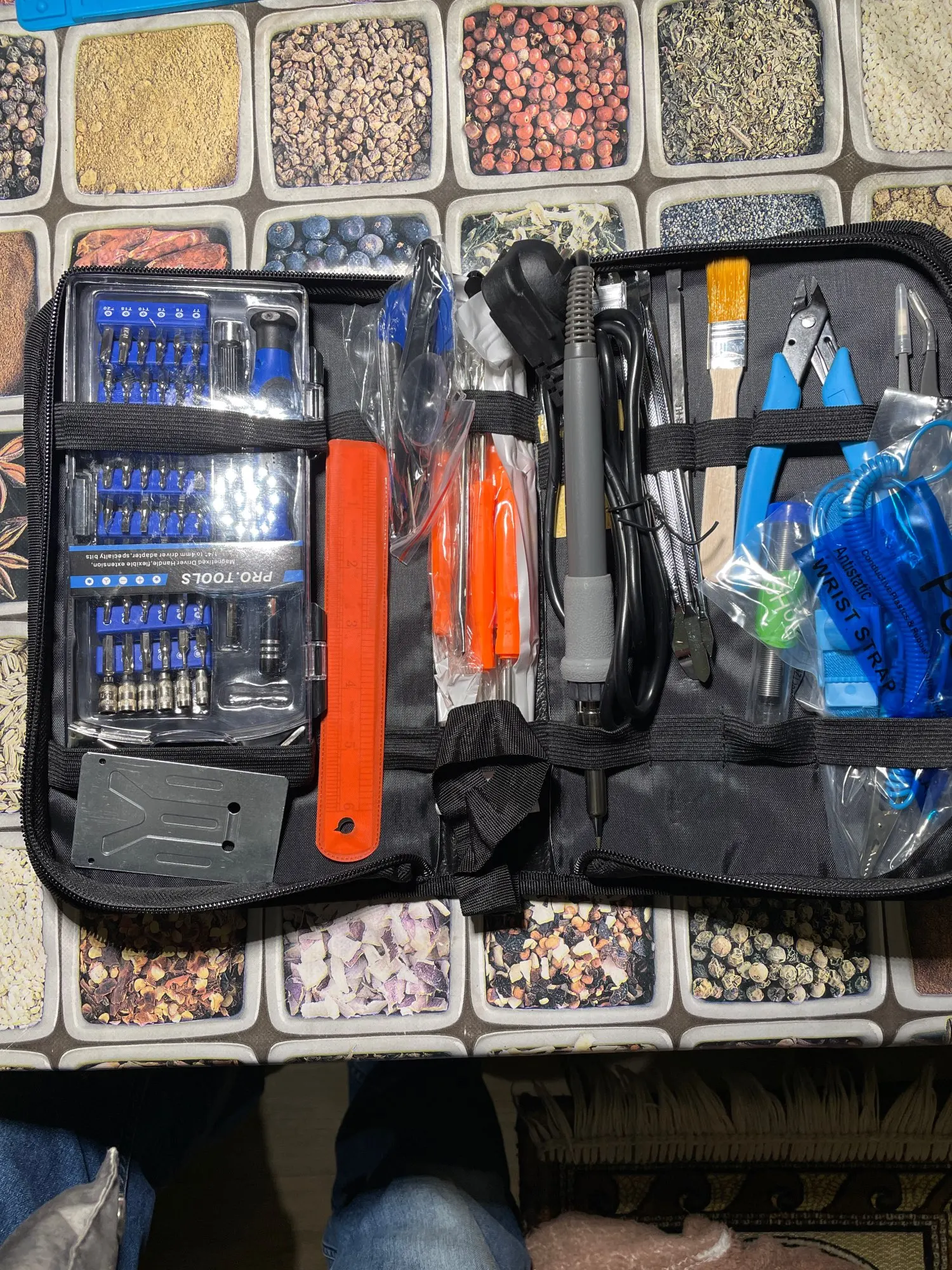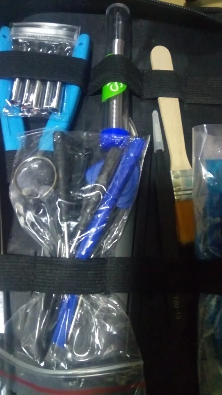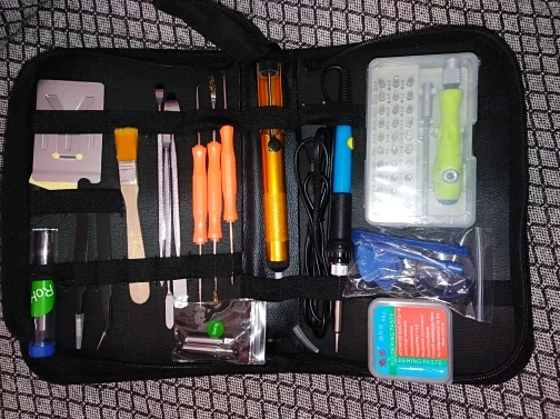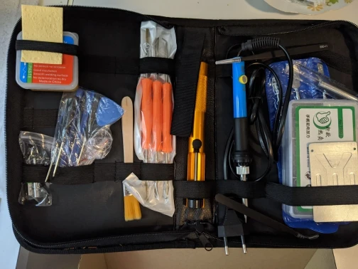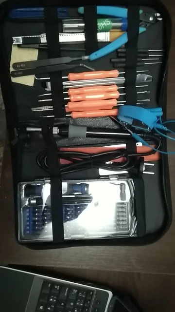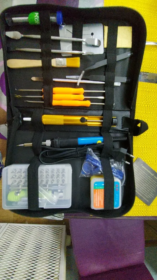 набор так себе - нет места для каждого инструмента. То есть лопатки, кисточки не очень хорошо фиксируются (смотрите фото) нет зачистки для проводов. + паяльник работает, температуру набирает быстро и держит до 480градусов ручка не нагревается.
