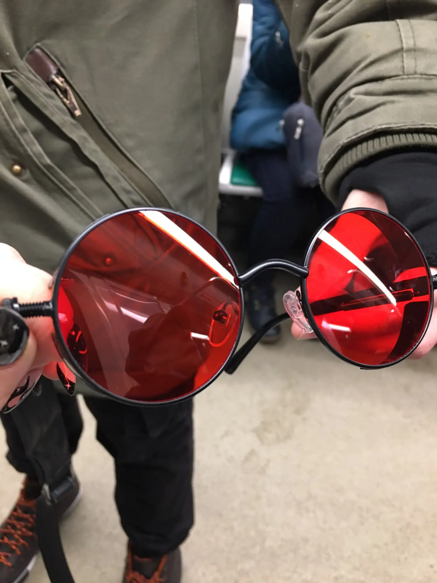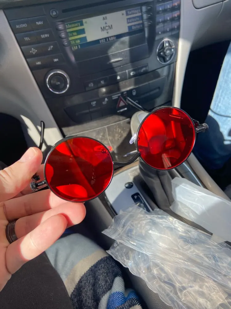 Посылка прибыла довольно быстро через 3 недели,что не может не радовать. Очки довольно удобно сели и подошли,но ,скажем так,глазам было очень тяжело из-за красного цвета...И после того,как сняла их,глаза болели примерно 15 минут...но для фото самое оно,круто смотрятся