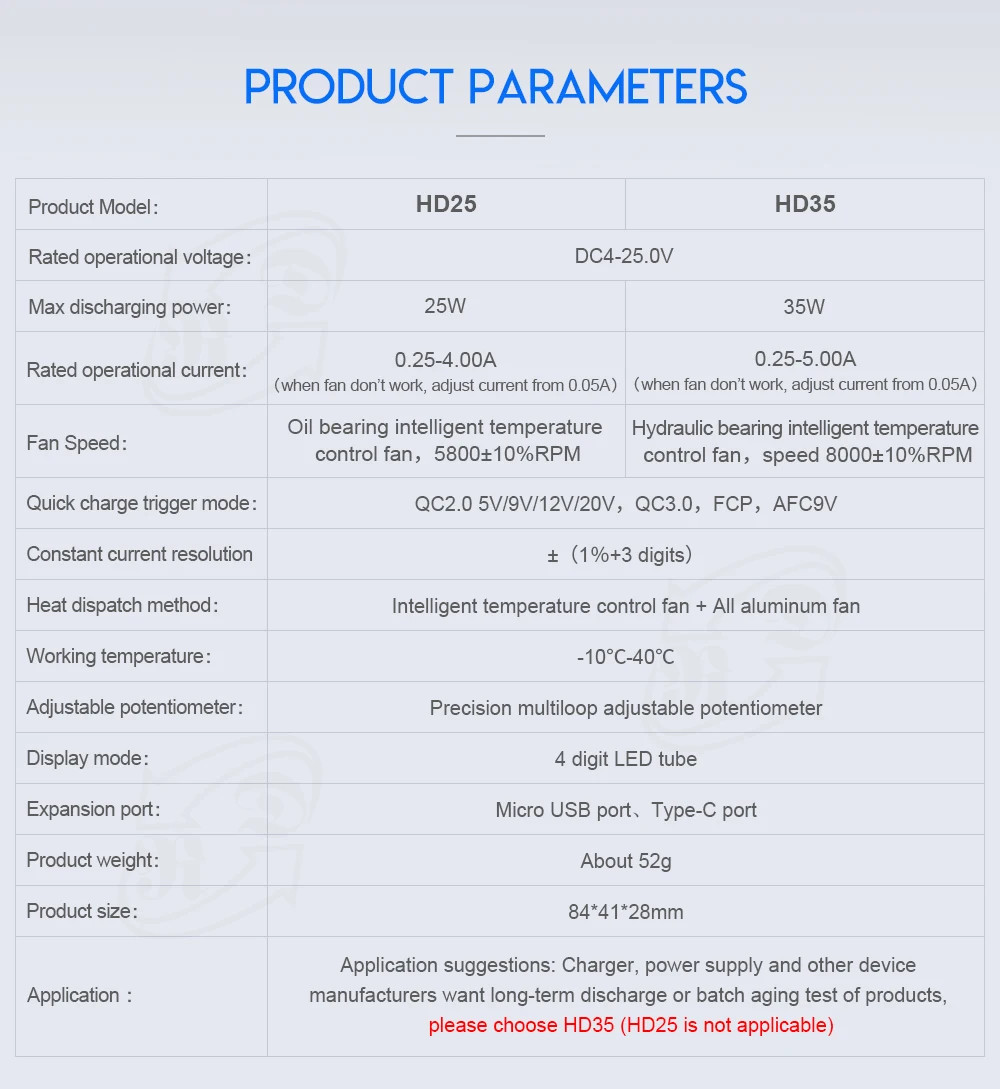 Рекомендации по применению: зарядное устройство, источник питания и другие производители устройств хотят провести испытания на длительный разряд или партийное старение продуктов, пожалуйста, выберите HD35 (HD25 не применимо)
