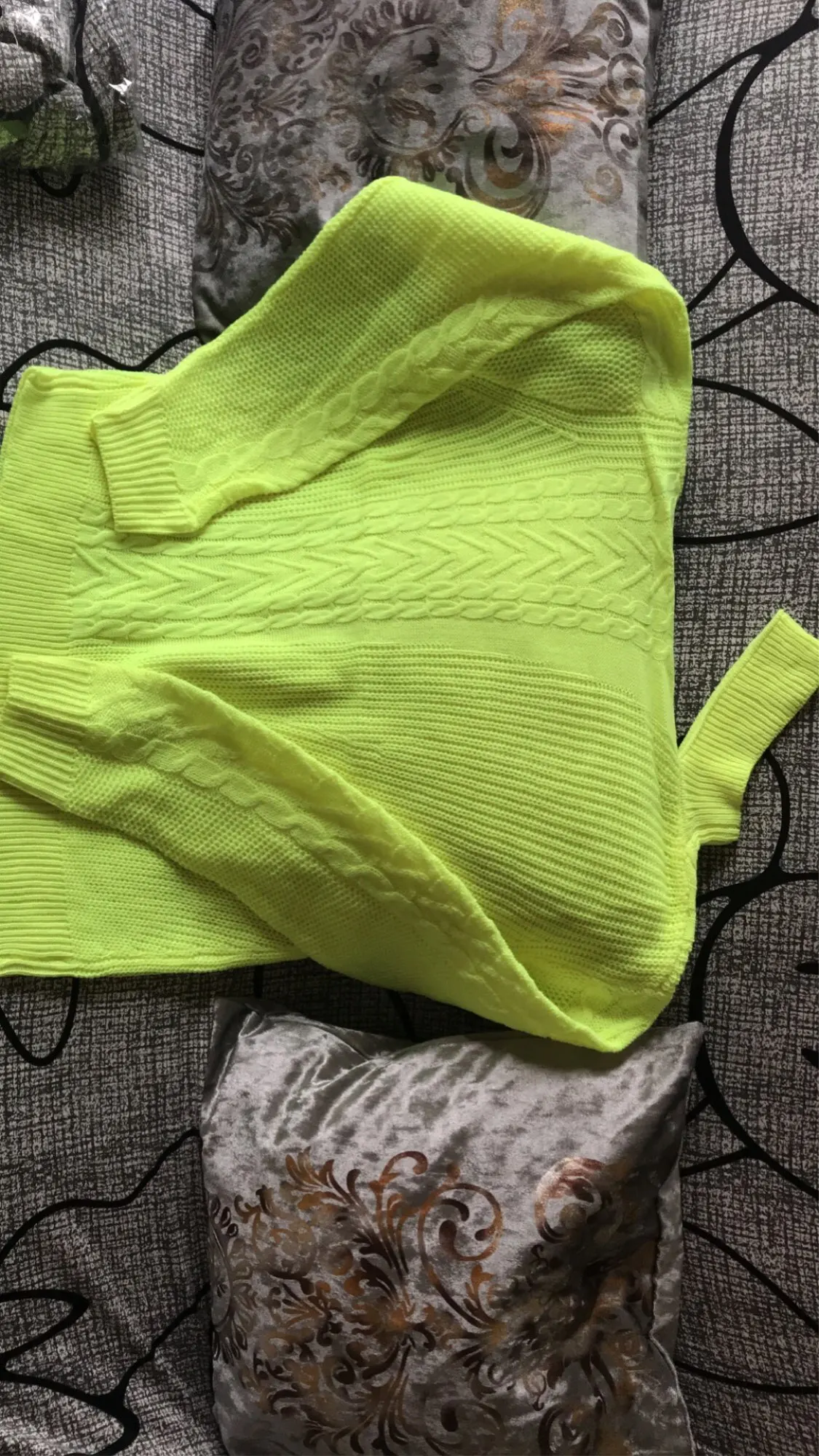 Очень симпатичная кофточка. Взяла больше на размер, но можно было б и на 2, чтоб ещё больше висела. Звезду сняла, т.к. с неё нитки посыпались, когда только достала из пакета, был запах, и ворот слишком большой, придется подшить. Свитер очень тонкий, легкий. Выглядит хорошо, но цена завышена на мой взгляд ))