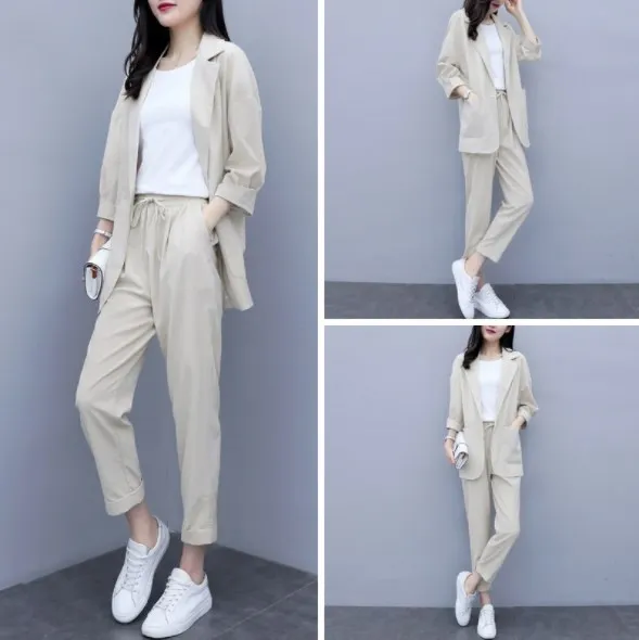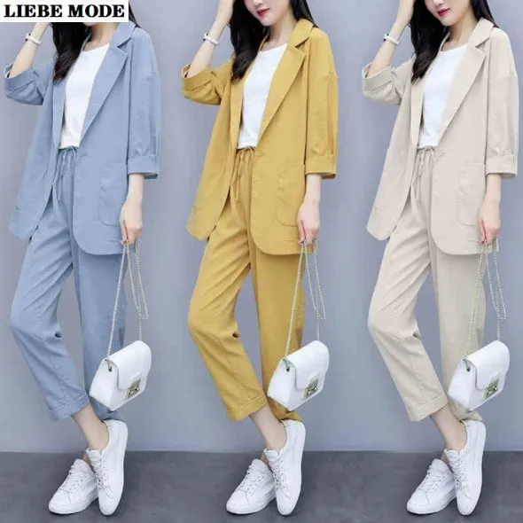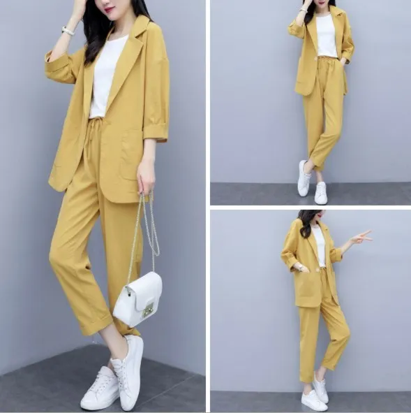 Женские повседневные Костюмы, синие, желтые, бежевые льняные брючные костюмы для женщин, комплект из 2 предметов, блейзер и брюки, летний прозрачный наряд