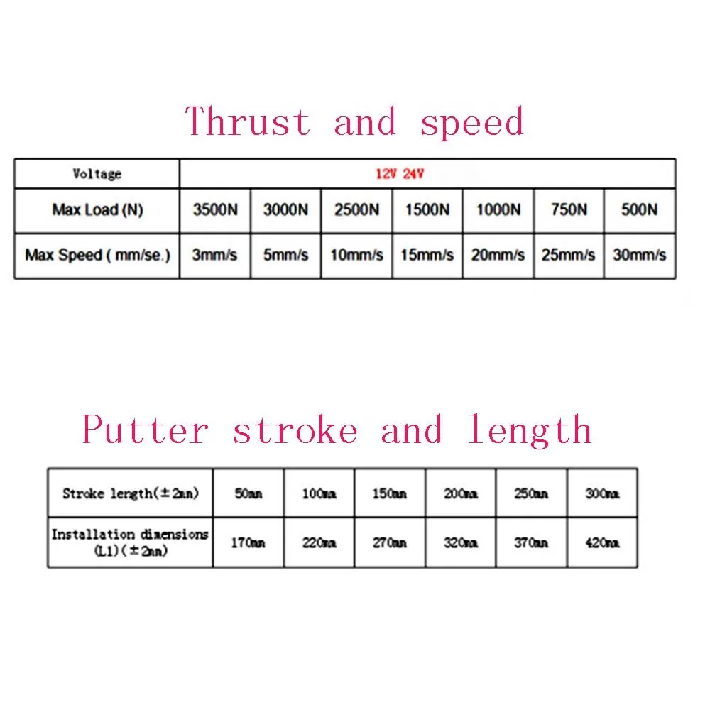 Вход 12 В постоянного тока Нагрузка 3500N = 350 кг = 770LBS Скорость 5 мм/сек = 0,2 дюйма/сек Ограниченный переключатель с Рабочий цикл 25% Материал внутренней трубки из алюминиевого сплава Цвет черный Рабочая температура-26 ~ + 65 градусов Преимущество: Более 15 лет опыта, умный размер, с металлическим двигателем повышенной мощности. Автоматически, очень безопасно. Ход означает длину движения линейного привода. L означает длину, когда линейный привод полностью удлиняется на 100%, между тем, он коснется ограниченного выключателя головки и остановится автоматически, очень безопасно.