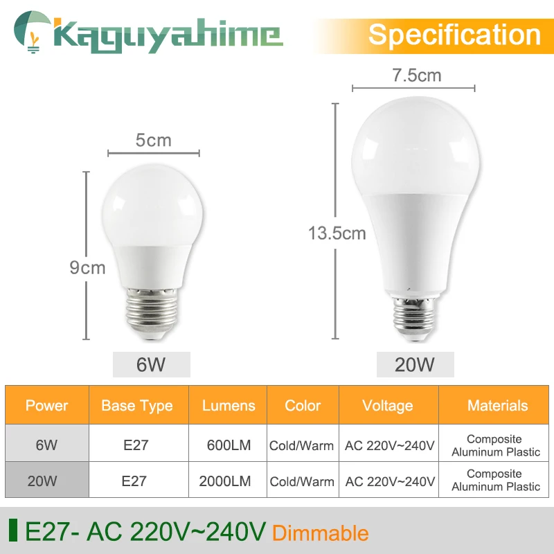 Светодиодная лампа Kaguyahime, 5 шт., цветтеплыйхолодный белый, Е27, Е14, 3-24 Вт, с регулируемой яркостью, 220 В, светодиодная лампа Е14, светодиодсветильник ПА Е27, 5 Вт, 6 Вт, 9 Вт, 12 Вт, 15 Вт, 20 Вт