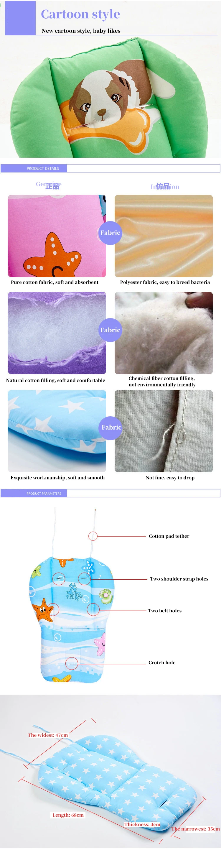 На стульчик chicco подошёл, но пришлось прорезать отверстие сильнее. Минус в том, что пришёл с пятнами, которые не отстирались, я открыла спор и мне вернули деньги. Пятна перевернула на другую сторону и в глаза не бросается. Но после первой же стирки в машинке появились катышки (немного, но факт) это при том, что ещё не пользовались подушкой. В целом товар неплохой для своей цены. Рисунок яркий, не поблек от стирки. Но ткань маркая, будет быстро пачкаться.