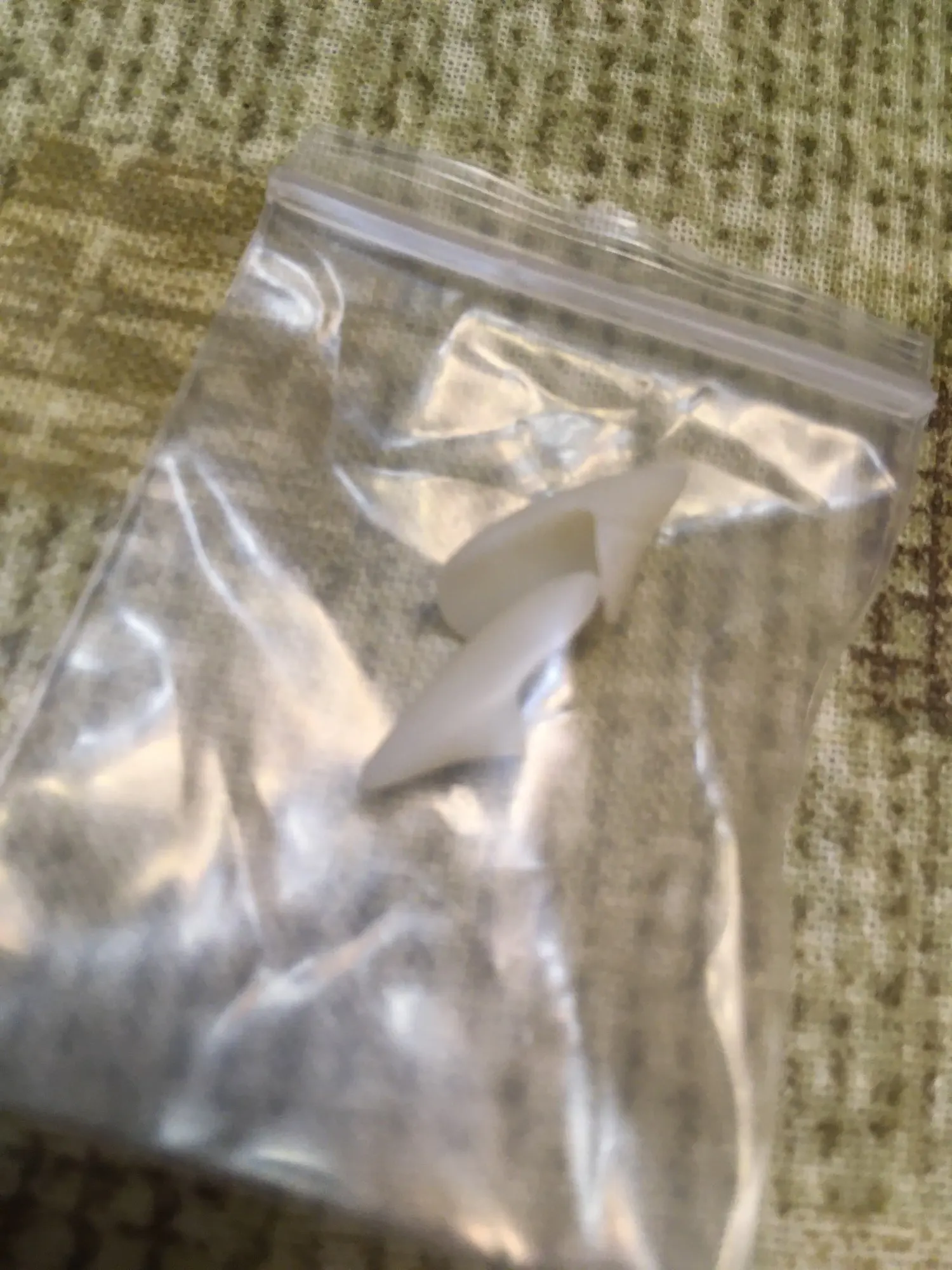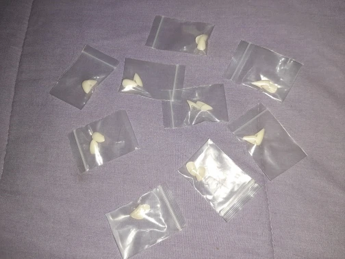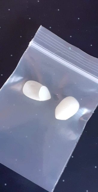 Быстро приехали клычки, они более белые, чем мои зубы, так что буду отбеливать. Пока не придумал, как буду их крепить, попробую крем корега для вставных челюстей.