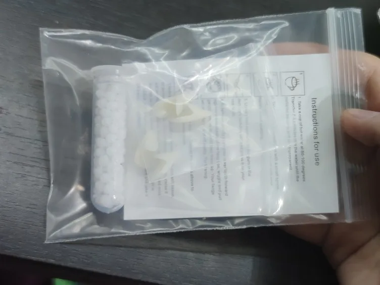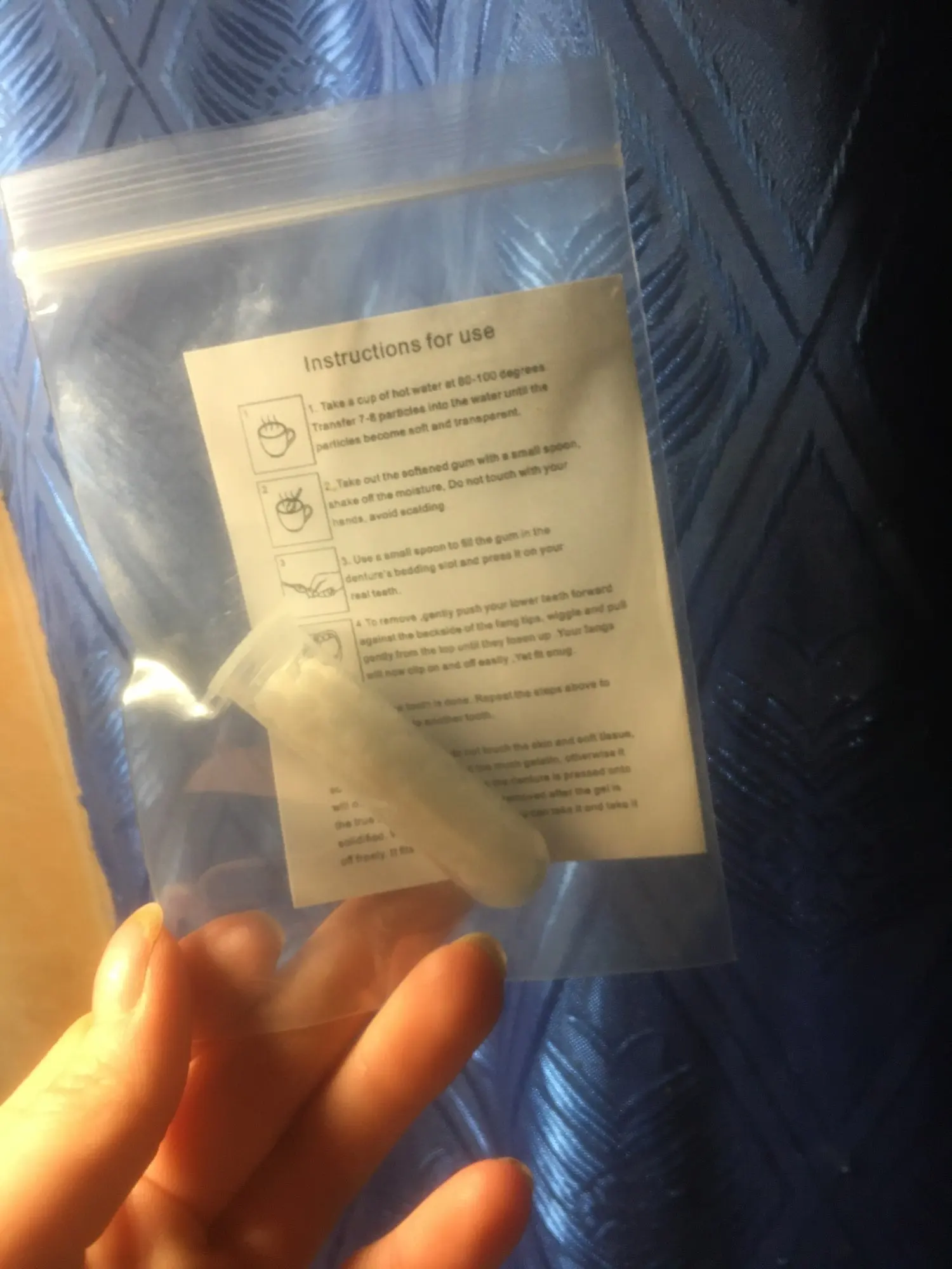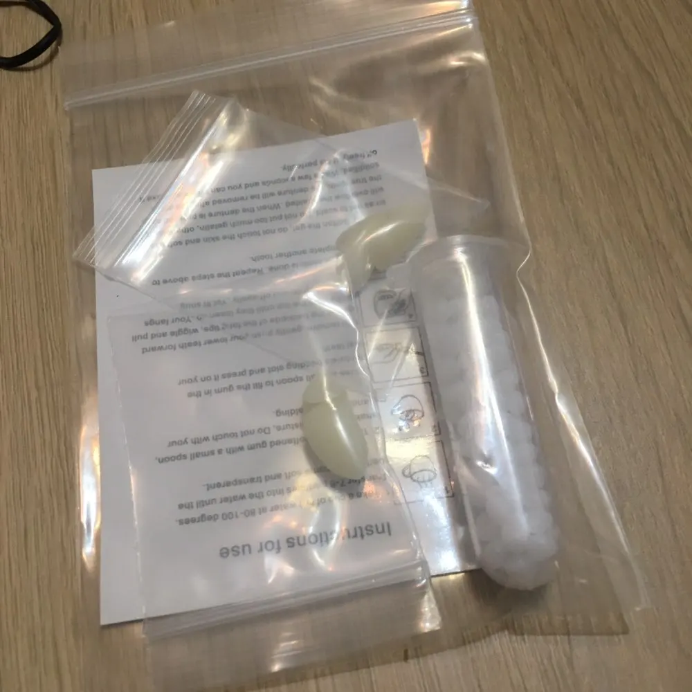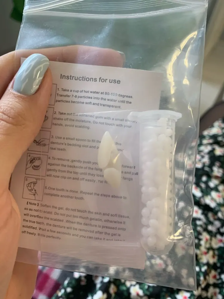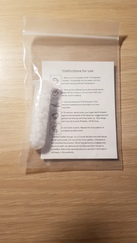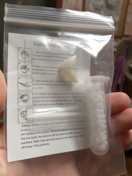 Заказывала клей и две пары клыков. На самом деле это не совсем клей: из него формируется необходимая форма, после застывания он твердый и не клейкий. Нужно приноровиться: у меня получилось сформировать не с первого раза, но его можно переиспользовать если растопить. Есть инструкция на английском. Зубы 13 мм вполне удобны, 15мм ещё не надевала, думаю будут мешать
