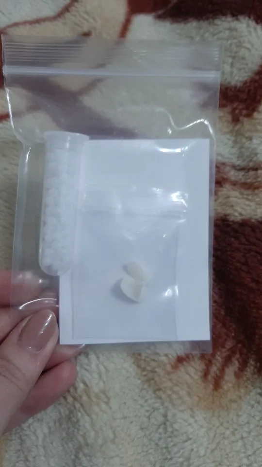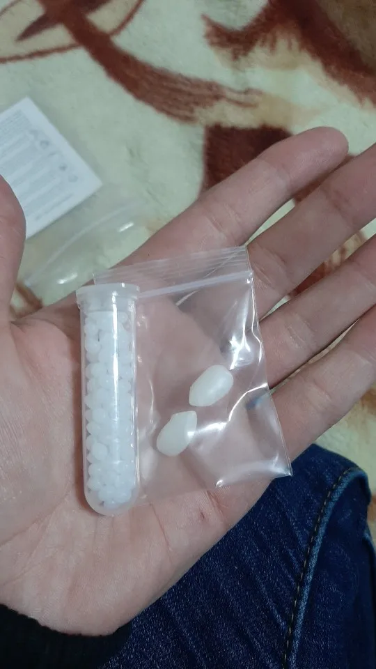 не до конца поняла как их лепить, но как-то прилепила) в комплекте клей не идёт, заказывайте отдельно! чтобы приклеить один зуб, мне хватило 2-3 шарика, а их там много. пришли в спб за 8 дней. держались мб минут 15, а ещё они белее моих зубов((((((( в общем, для фоток с обработкой норм! ig: kira.burton