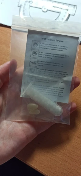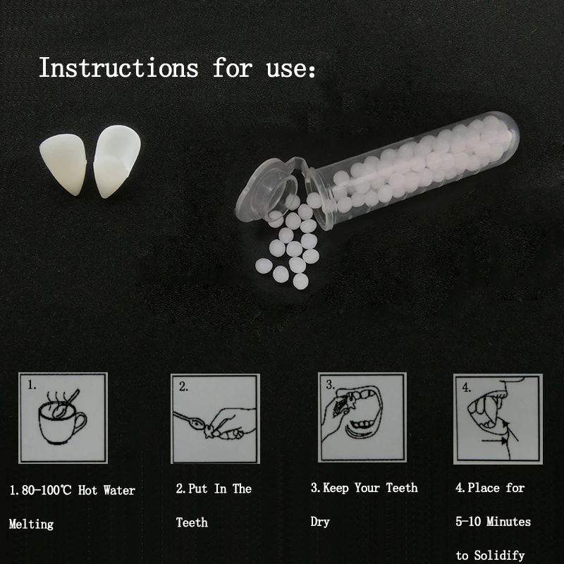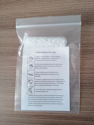 Хороший клей. Прилагается инструкция на английском. Когда будете плавить клей в горячей воде на ложке, будьте готовы потом отдирать от ложки остатки клея. Один клык смогла приклеить, второй не удалось из-за скола на моем натуральном зубе.