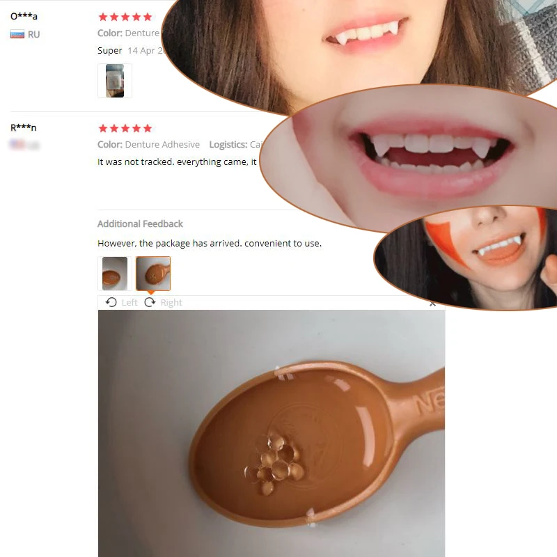 Нигде не сказано о том, что «клей» для зубов нужно отдельно покупать, так что я немного расстроена. Думала, что он в комплекте с зубами, а оказалось, что нужно отдельно докупать. Но выглядит прикольно, может быть есть другие способы, как приклеить эти зубы, чтобы не отпадали?