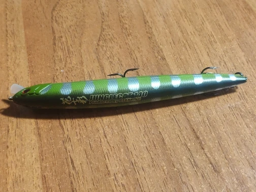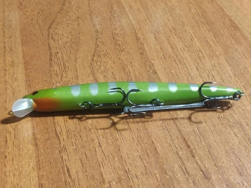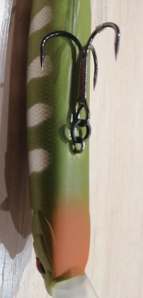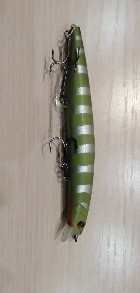 Цвет С, зелёный с серебристыми полосами. Краска матовая, петли пролиты хорошо. На мой взгляд, крючки мелковаты для такого воблера...