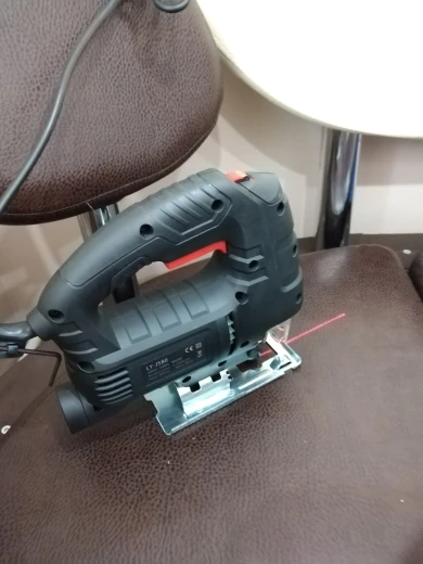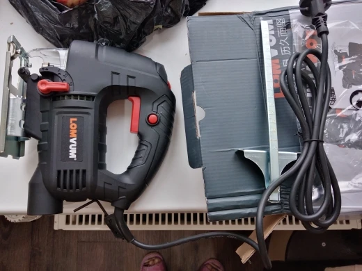 Лобзик на вид нормальный. Запах пластмассы сильный, надеюсь со временем выветрится. Попробовали на мебельном ДСП 2 см, пилит нормально.