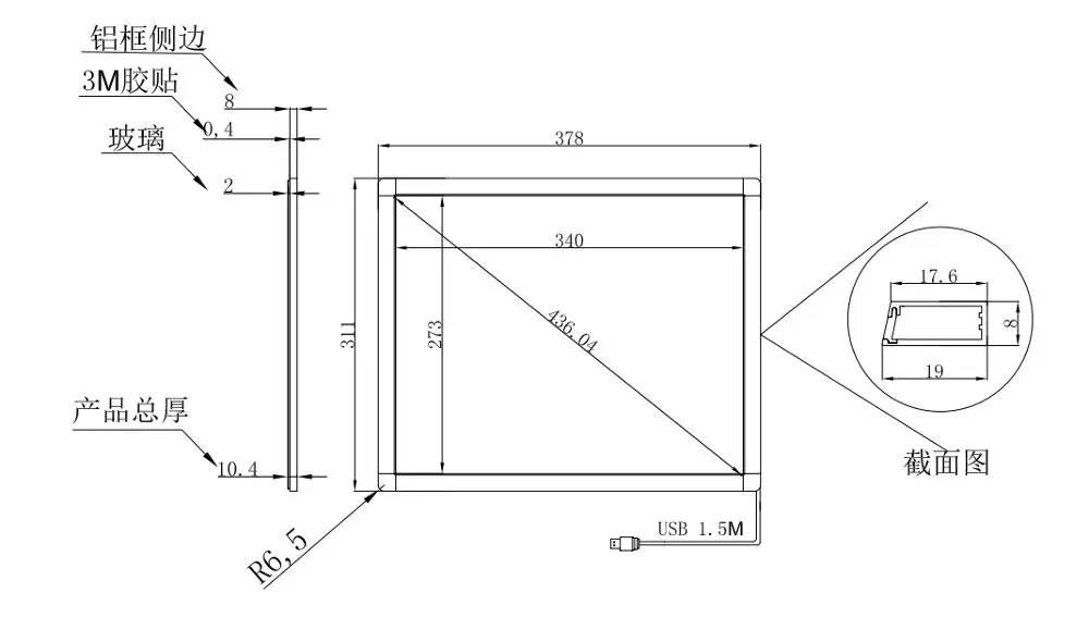 17 дюймов 10 точек ИК мульти сенсорный экран Размер продукта чертеж: