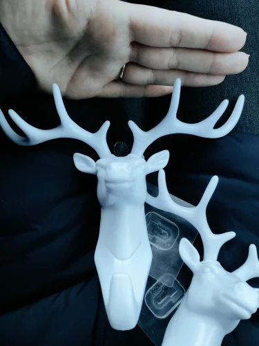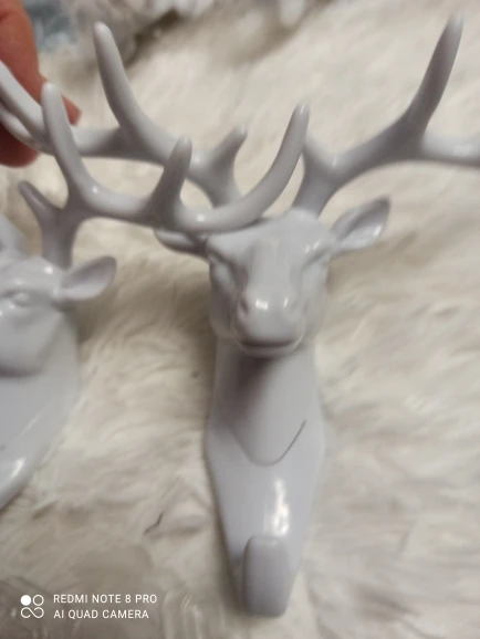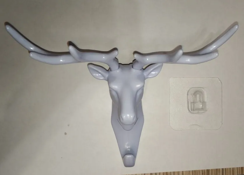 Цвет оленя - белый с голубым оттенком, матовый. Купила слона и оленя - они отличаются по цвету. Слон более белый (без голубого отлива) и глянцевый. Вместе их повесить не получится. Есть заусенцы. В наборе специальный крючок с клейкой стороной, чтобы приклеить к стене (другой поверхности). В целом норм. Спасибо!)