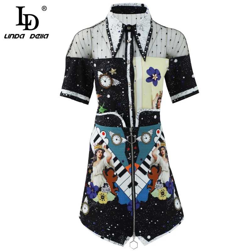 LD LINDA DELLA модный подиумный летний костюм для женщин с коротким рукавом, сетчатая рубашка и юбка с принтом персонажа, Женский комплект из двух предметов