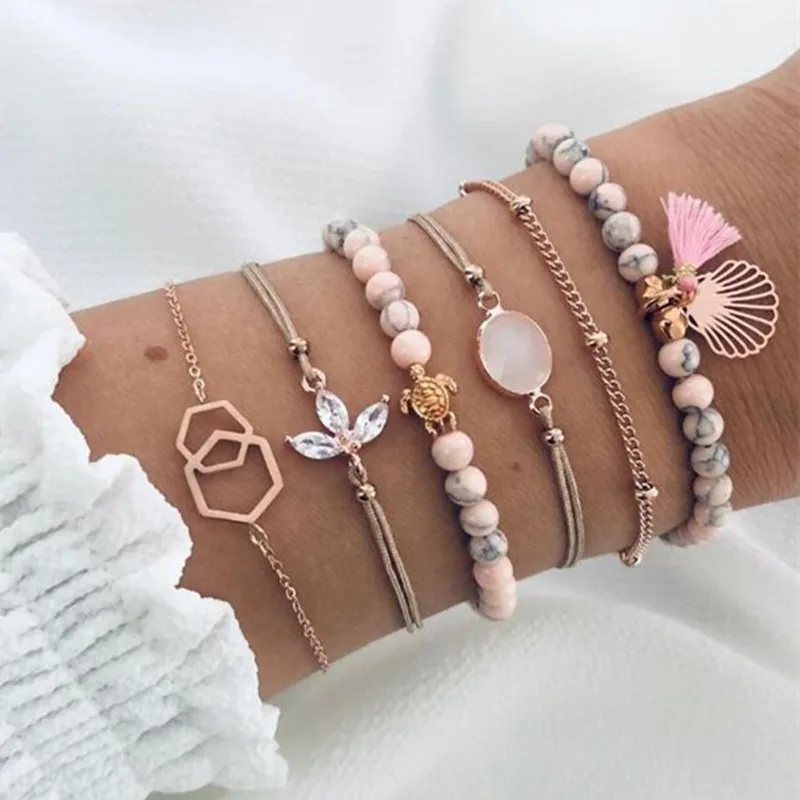 DIEZI Прямая поставка богемный розовый Набор браслетов-цепочек с кисточками для женщин Черепаха ракушка цветок Кристалл бисер браслеты ювелирные изделия