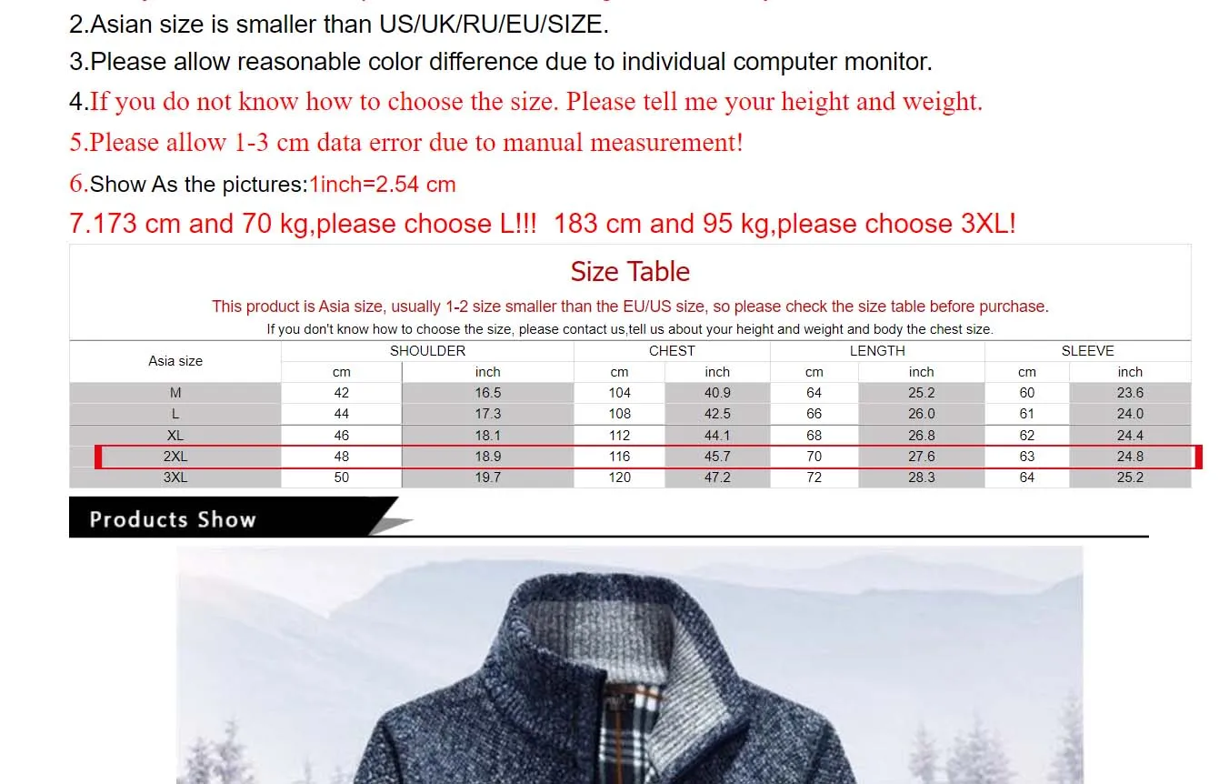 1. Эта куртка Азиатского размера, пожалуйста, выбирайте на 1-2 размера больше, чем обычно.2. Азиатский размер меньше, чем размер США/Великобритании/РФ/ЕС.3. Пожалуйста, учитывайте разумную разницу в цвете из-за индивидуальных мониторов компьютера.