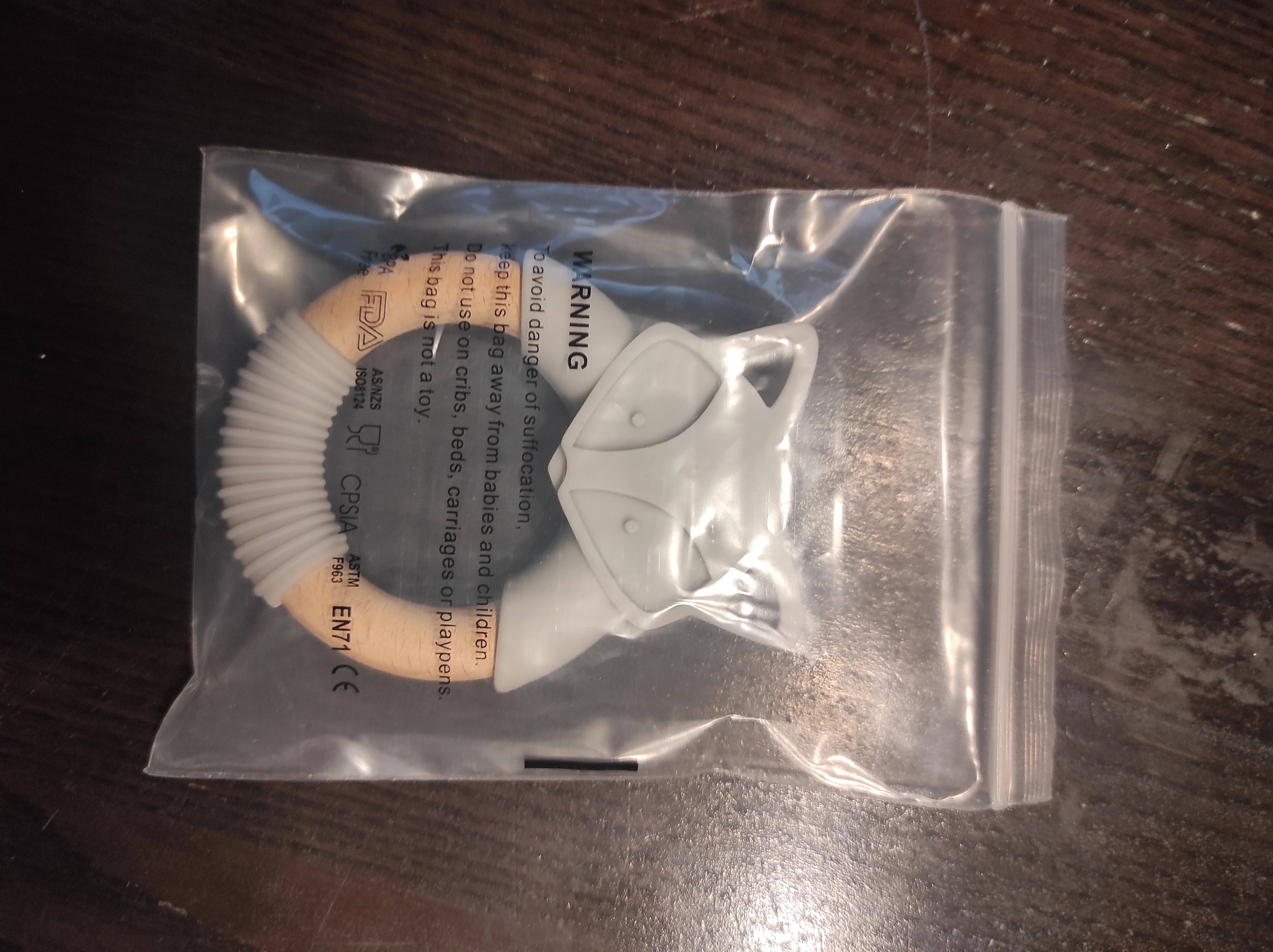 Посылка шла около месяца, грызлик упакован в пакетик. По качеству хороший, приятный на ощупь, посторонних запахов нет