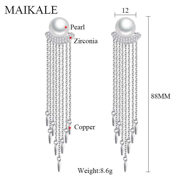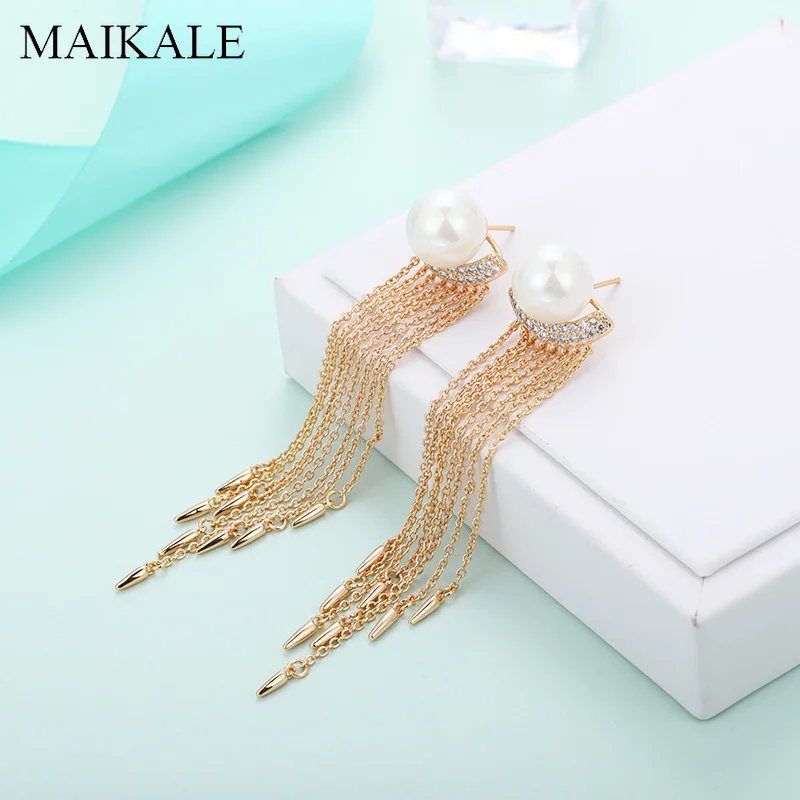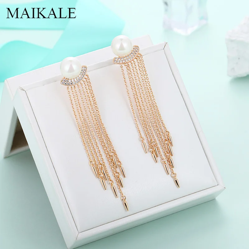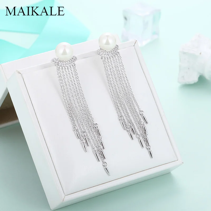 MAIKALE, трендовые длинные серьги с кисточкой и цепочкой, с жемчугом, золотые, серебряные, с кубическим цирконием, висящие висячие серьги с жемчугом для женщин, ювелирные изделия