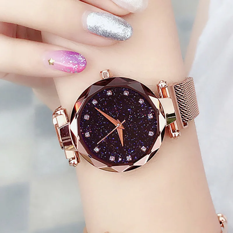 Лидирующий бренд, роскошные часы для женщин, магнитная пряжка, звездное небо, кварцевые часы для женщин, розовое золото, сетка, Геометрическая поверхность, женские наручные часы
