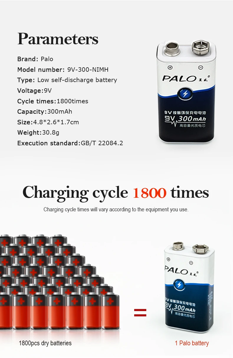 PALO 300mah 9v батарея перезаряжаемая 9V 6F22 батарея Ni-MH nimh дл...
