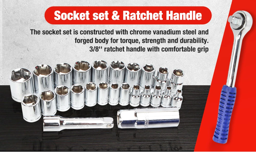 10 шт. 3/8 "Dr. Розетки (9, 10, 11, 12, 13, 14, 15, 16, 17, 19 мм)