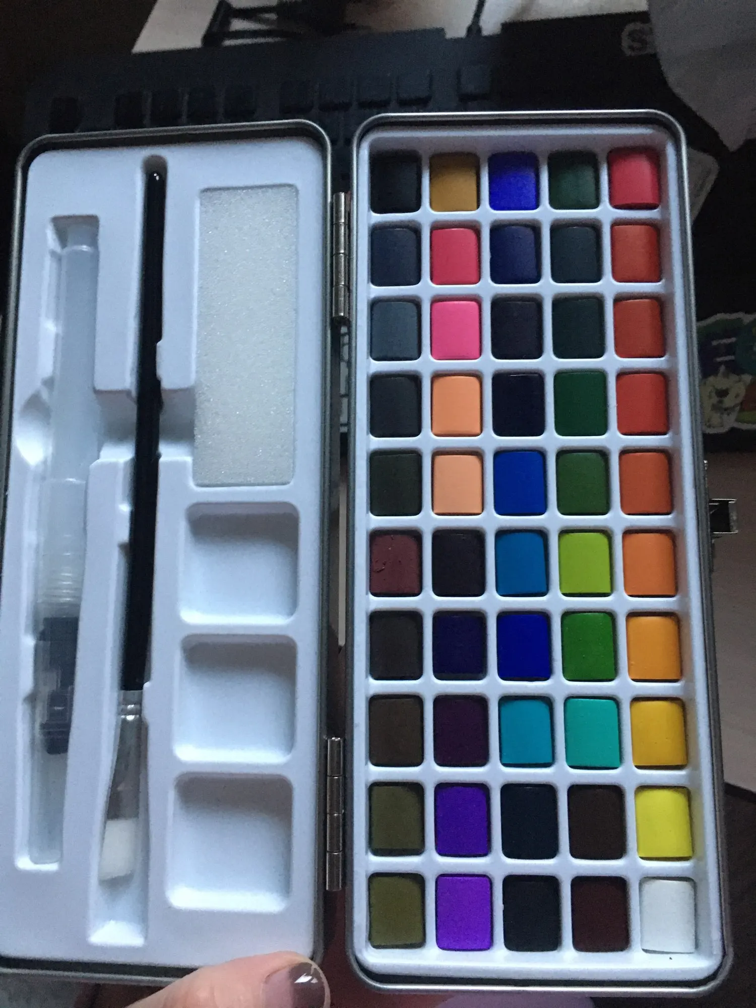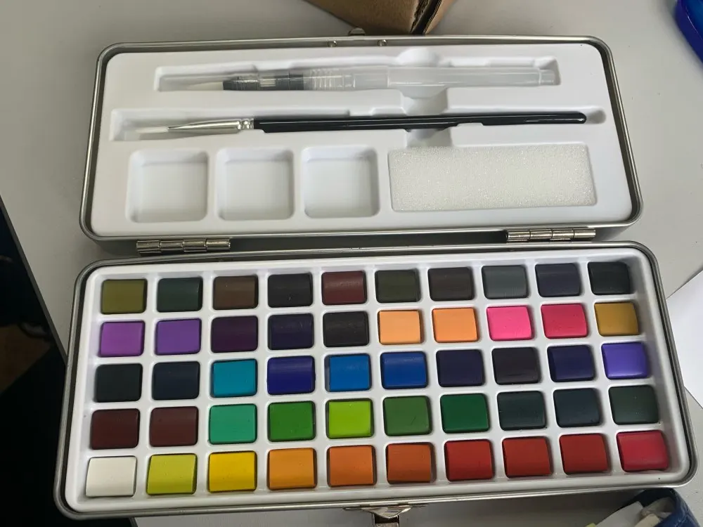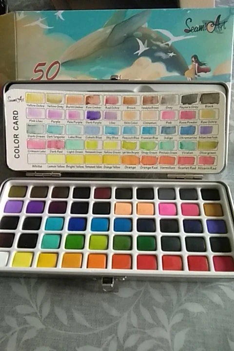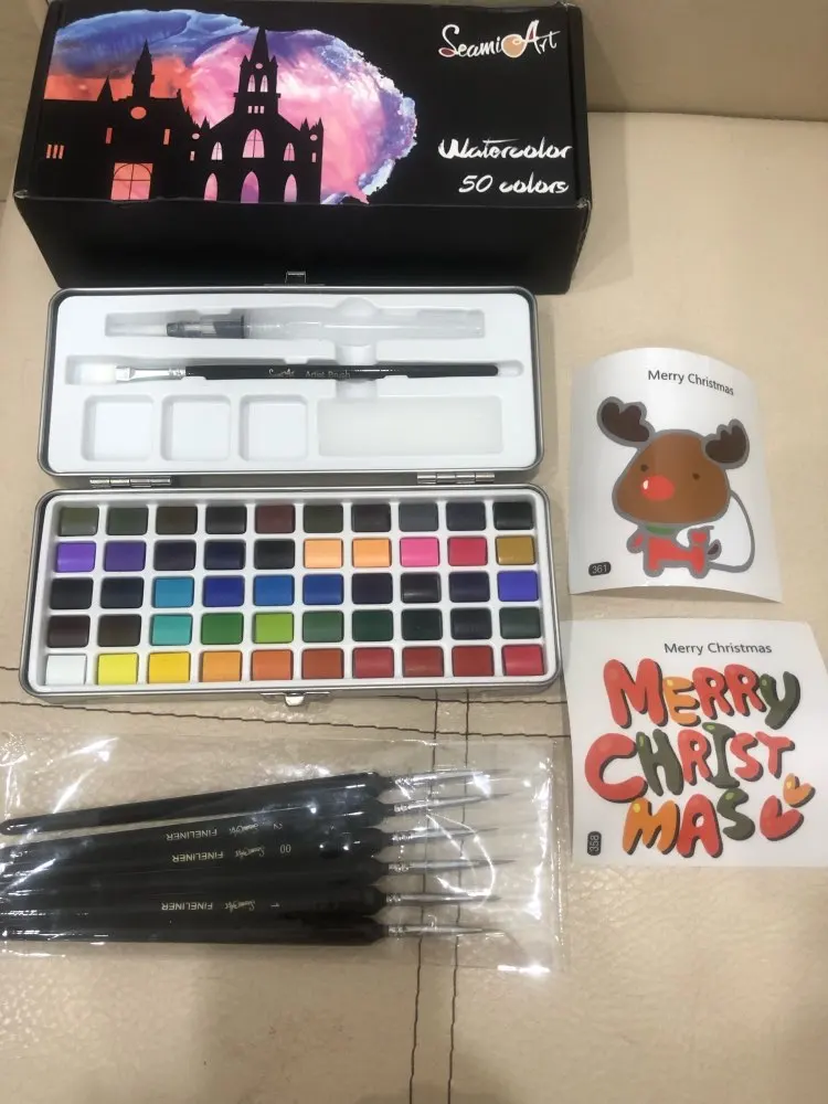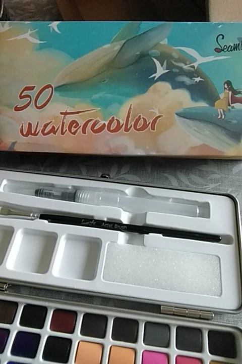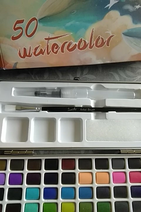 Коробка из акварели. Коробка металлическая, и она была помята, несмотря на то, что она пришла в картонной коробке и внутри другой более толстой картонной коробки. Снаружи в коробках не было никакого удара или дефекта. Внутри все в идеальном состоянии. 50 таблеток разных цветов все на месте, без трещин, трещин и дефектов. Он поставляется с обычной кистью и с другой водой, губкой. Принесите бумагу с 50 тарелками, чтобы положить цвет каждого и иметь образцовую веру. CAME with 4 gift stickers Очень быстрая доставка и получение. Рекомендуемый товар и продавец Обновленная информация отслеживания в любое время