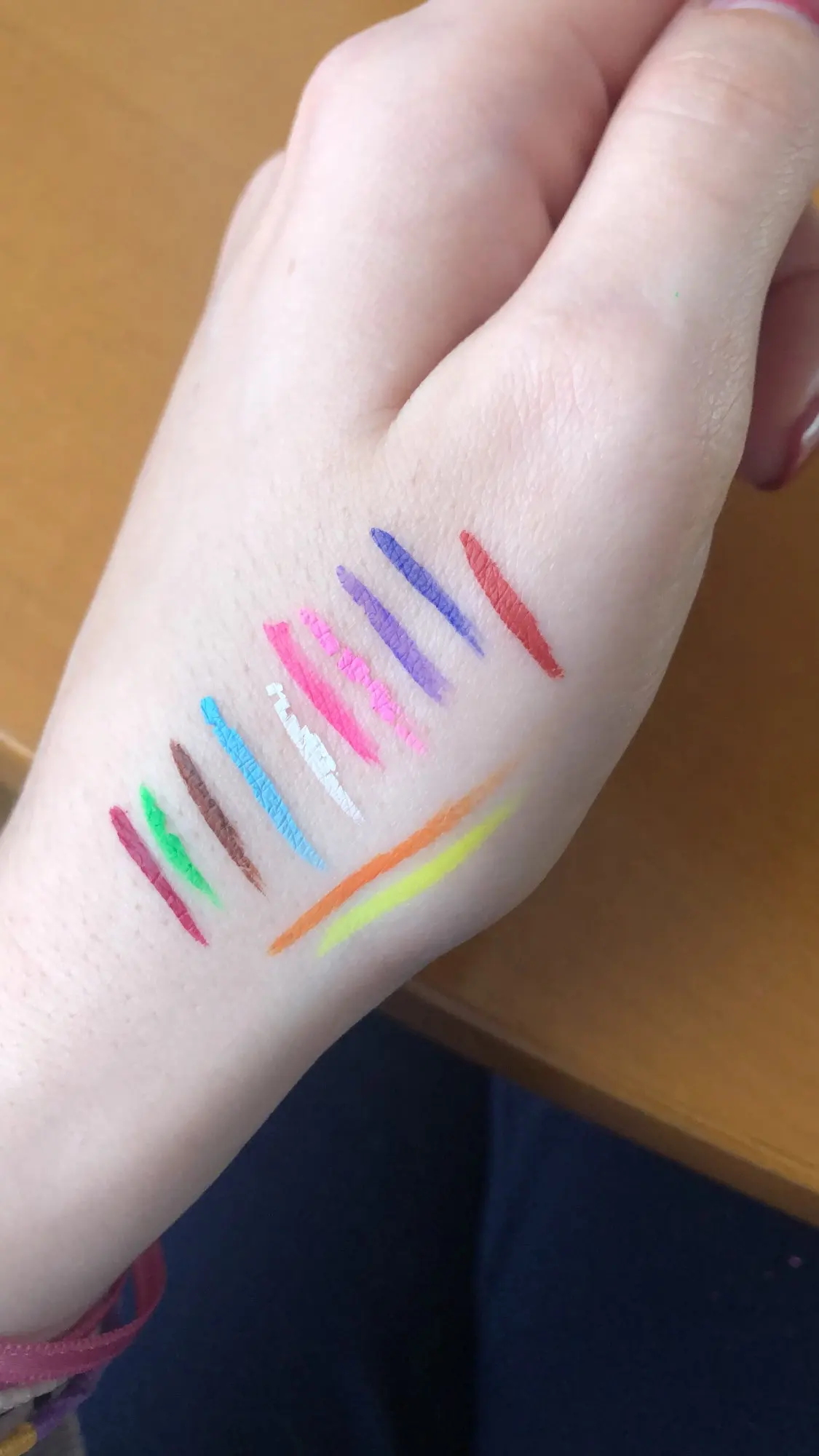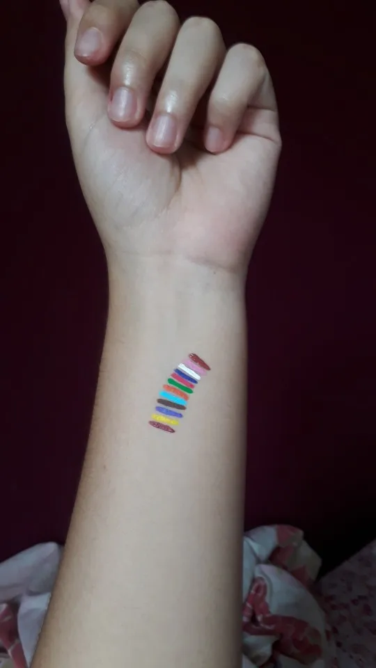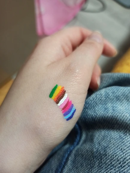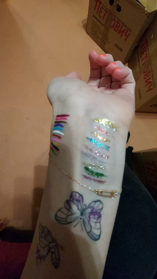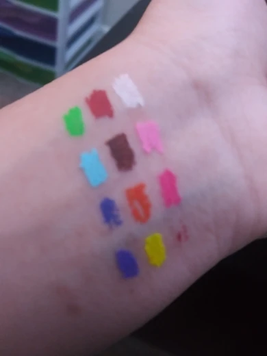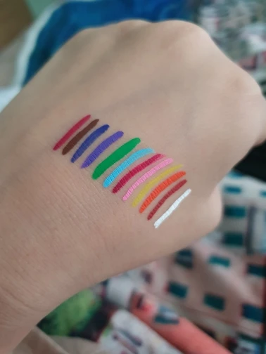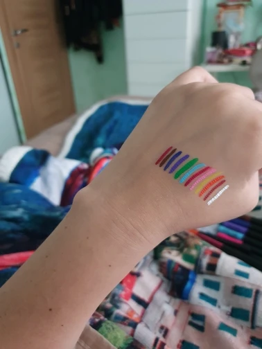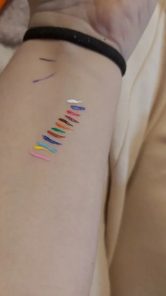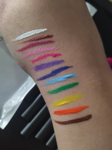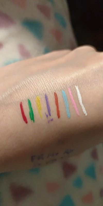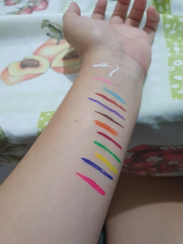 Офигенные подводки. Отлично держатся, вода их не портит, единственное, что они от кожи отваливаются на сгибах. Желтый и зелёный светятся. Нарисованный на тыльной стороне ладони цветок живёт уже три дня, не смотря на мытье рук и посуды. Подводка на глазах живёт несколько часов. Краска отваливается кусочками, не растворяется.