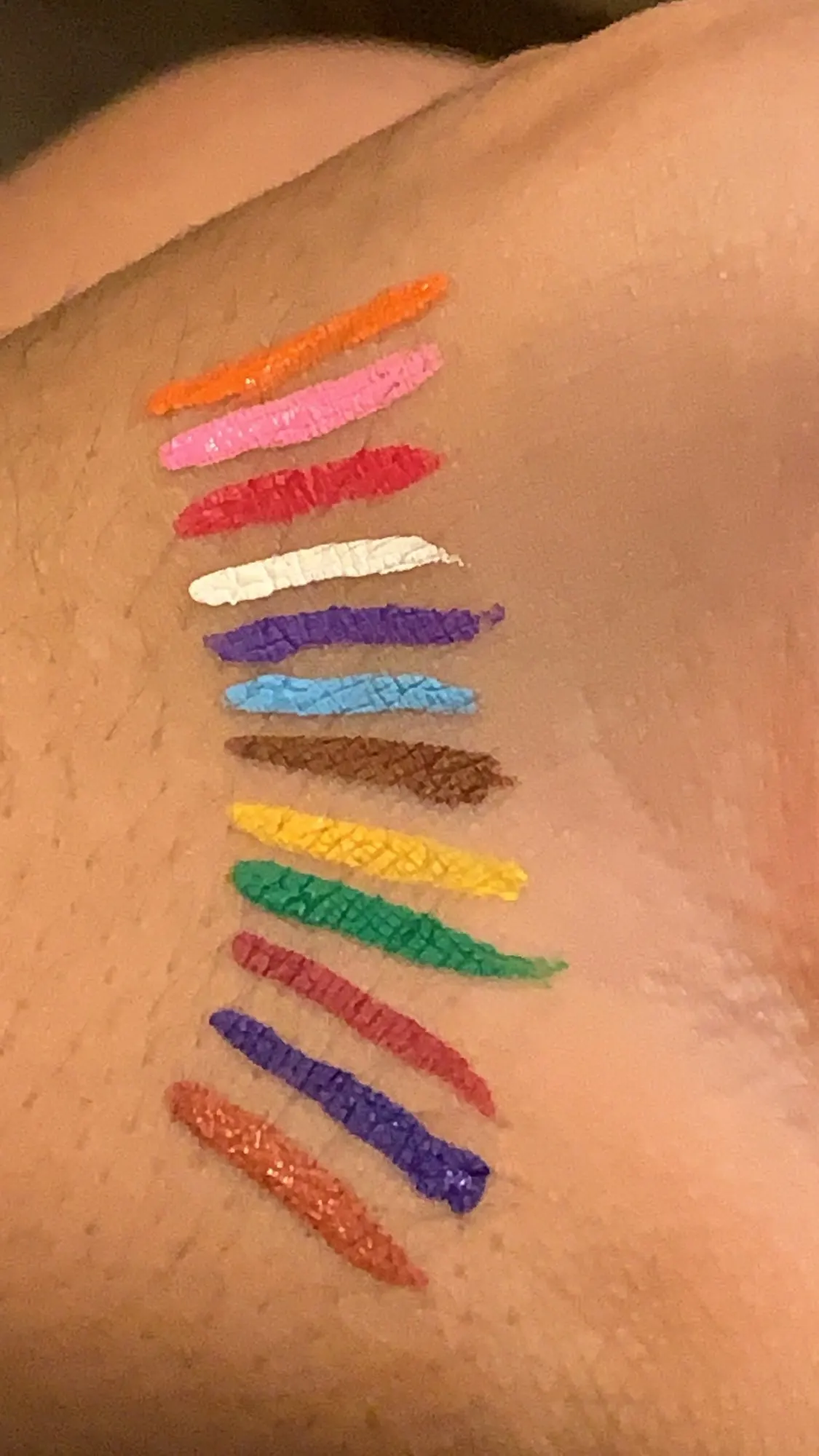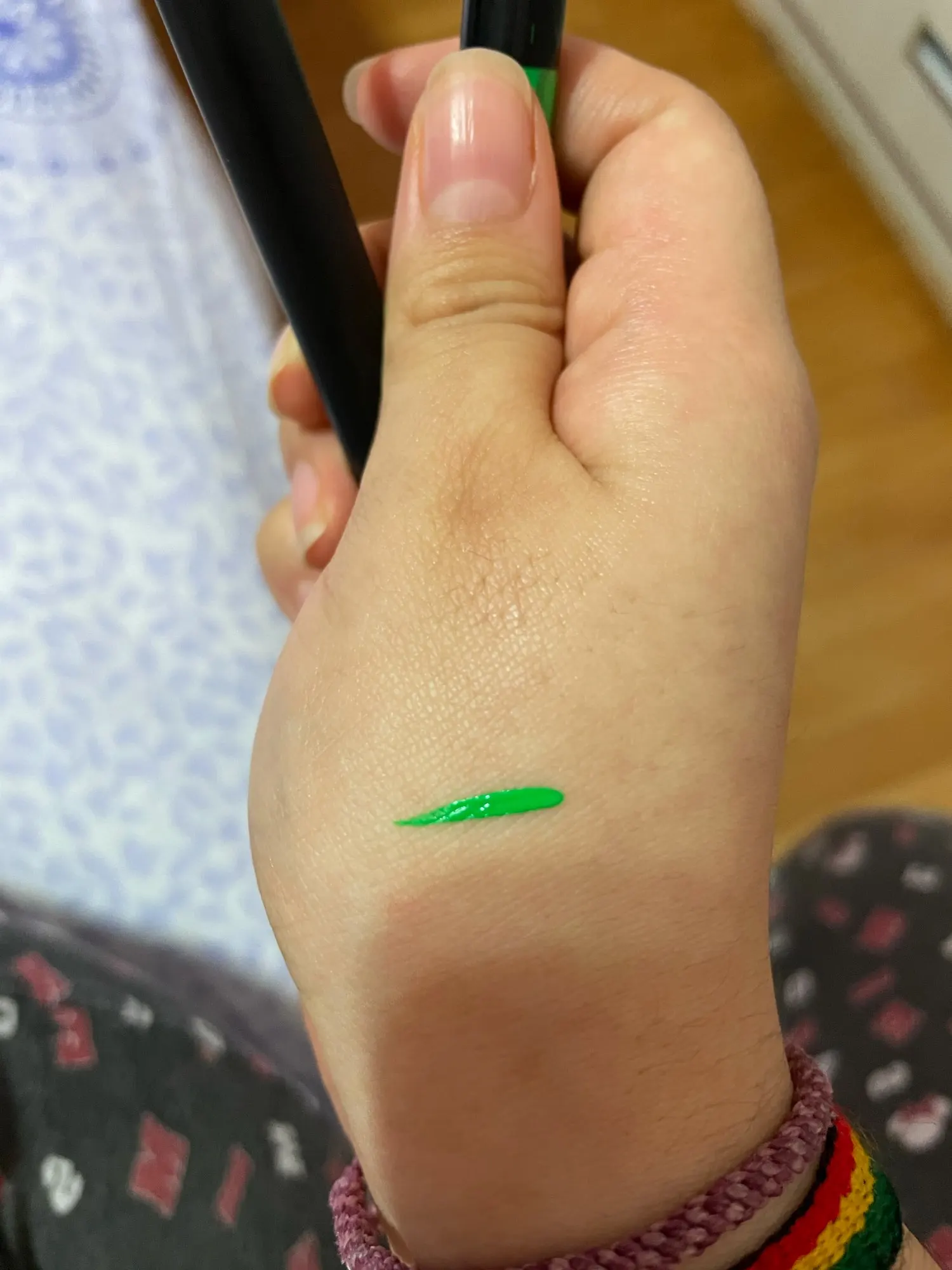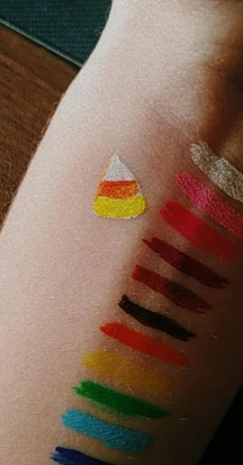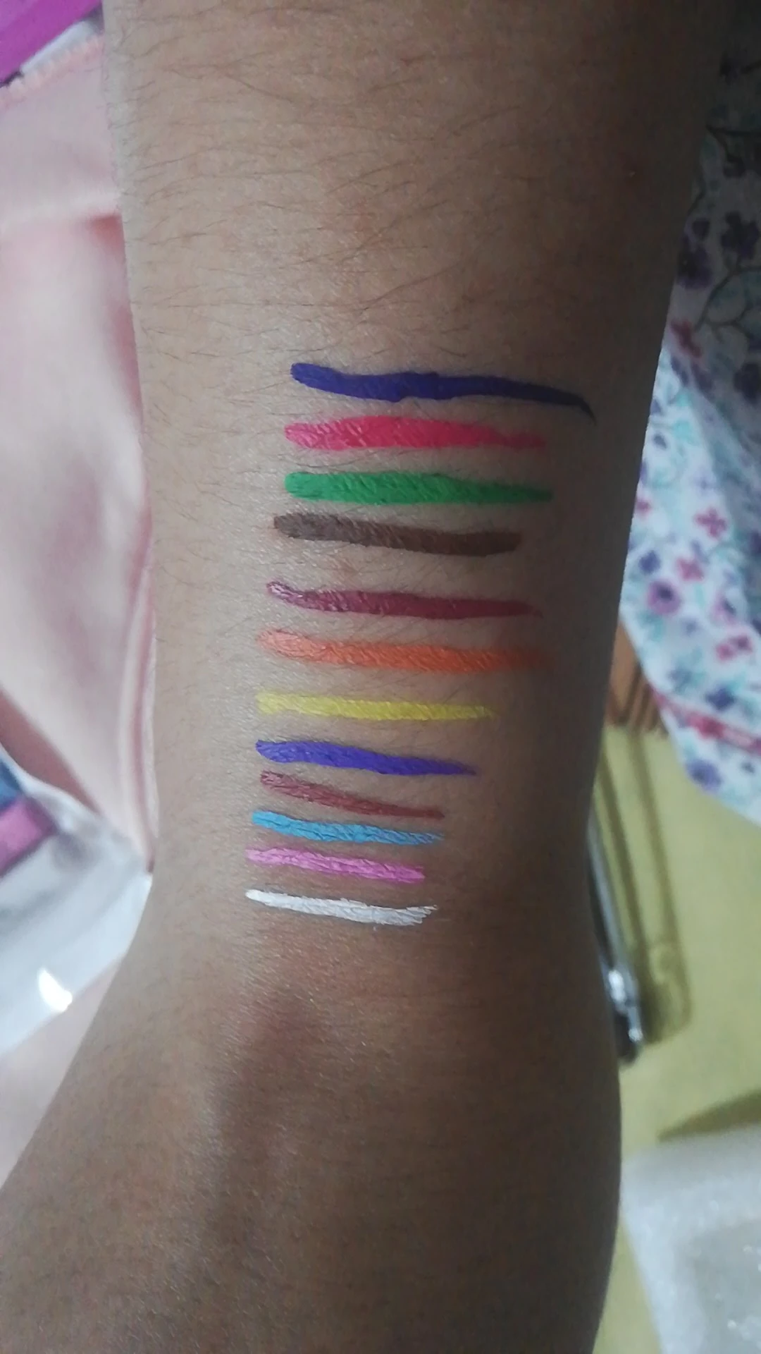 Офигенные подводки. Отлично держатся, вода их не портит, единственное, что они от кожи отваливаются на сгибах. Желтый и зелёный светятся. Нарисованный на тыльной стороне ладони цветок живёт уже три дня, не смотря на мытье рук и посуды. Подводка на глазах живёт несколько часов. Краска отваливается кусочками, не растворяется.