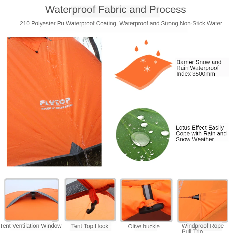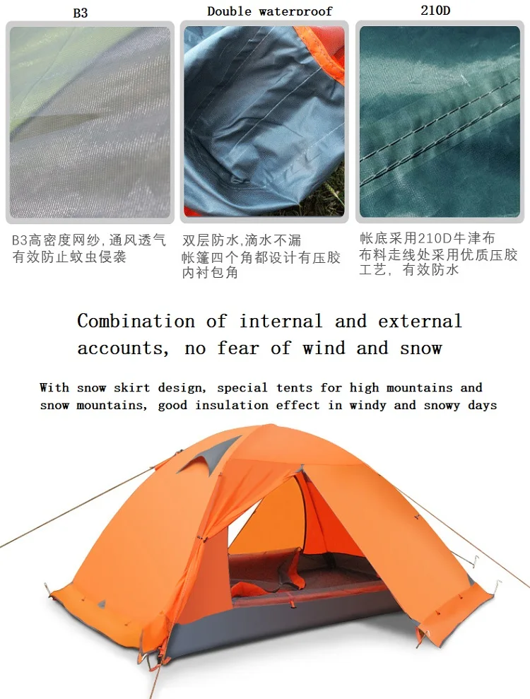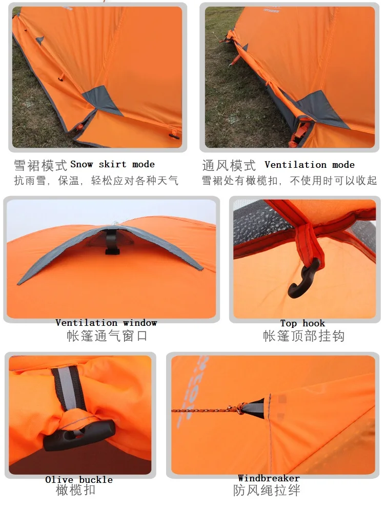 Особенности: Открытое Вентиляционное окно (хорошая вентиляция), оба конца имеют расширения (можно поставить оборудование), передняя и задняя стороны удлиняются 60 см, левый и правый также имеют расширение, чтобы повесить землю, чтобы увеличить сопротивление ветра, внутренний дизайн счета является стильным и благородным. На верхней части палатки есть легкий крючок для палатки, а вокруг палатки-снежная юбка, чтобы повысить устойчивость к дождю.