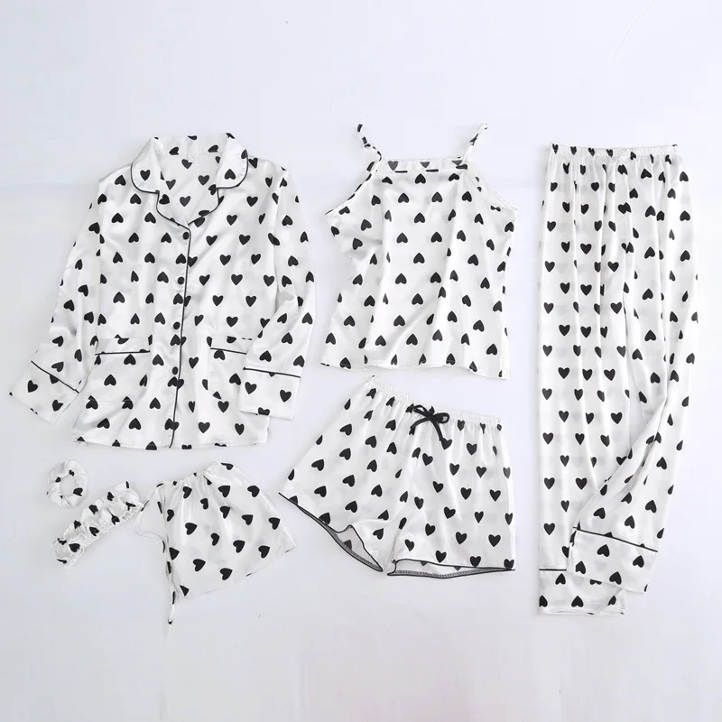Women Pajamas Sets Spring Summer 7 Pcs Set Silk Print Shorts Long S...