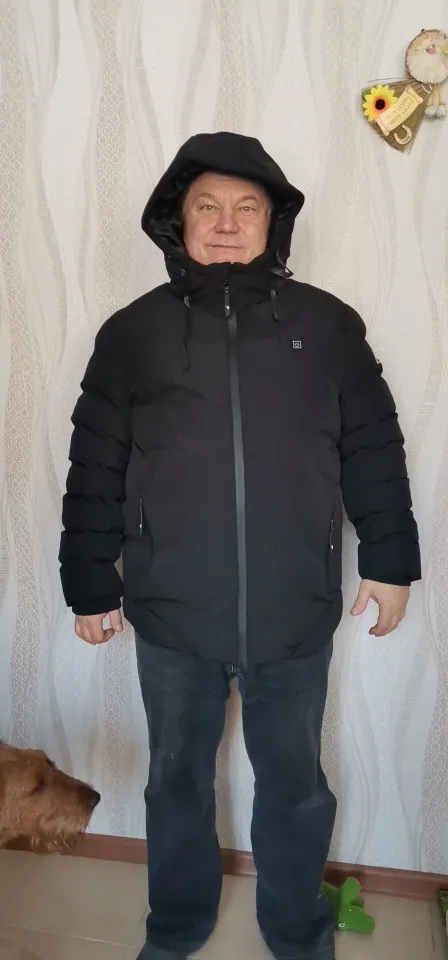куртка бомба просто. размер мужу подошёл. сначала переживал, что с кофтой не застегнется, но убедила его, что без кофты тепло будет...главное заряжать пауэр банк. греет отлично, все режимы работают. муж за пару минут до выхода включает подогрев, выходит и идет с комфортом. при получении обрезали четыре ниточки, но в целом пошив и швы хорошие. спасибо продавцу