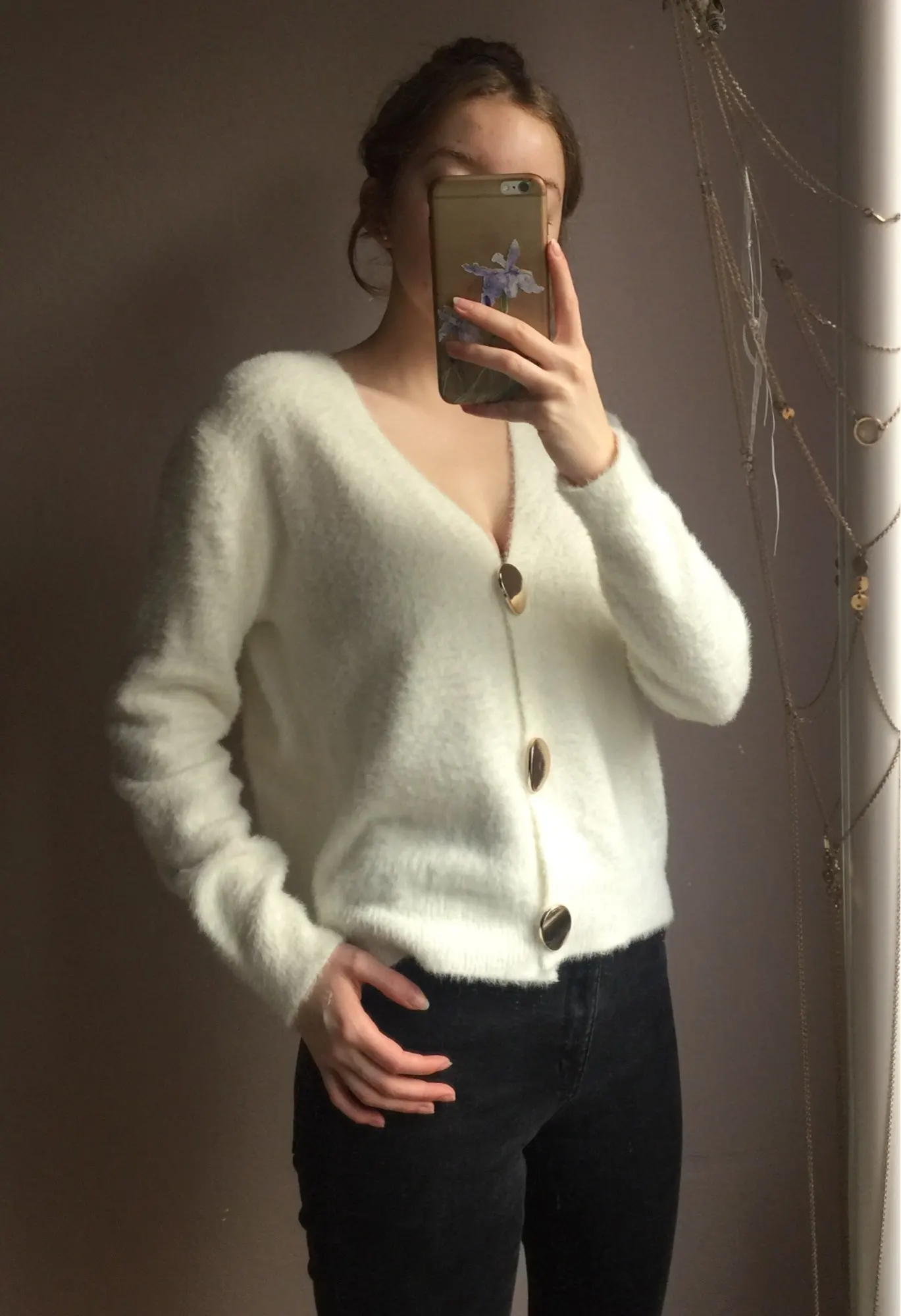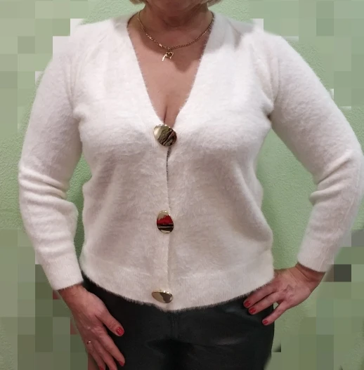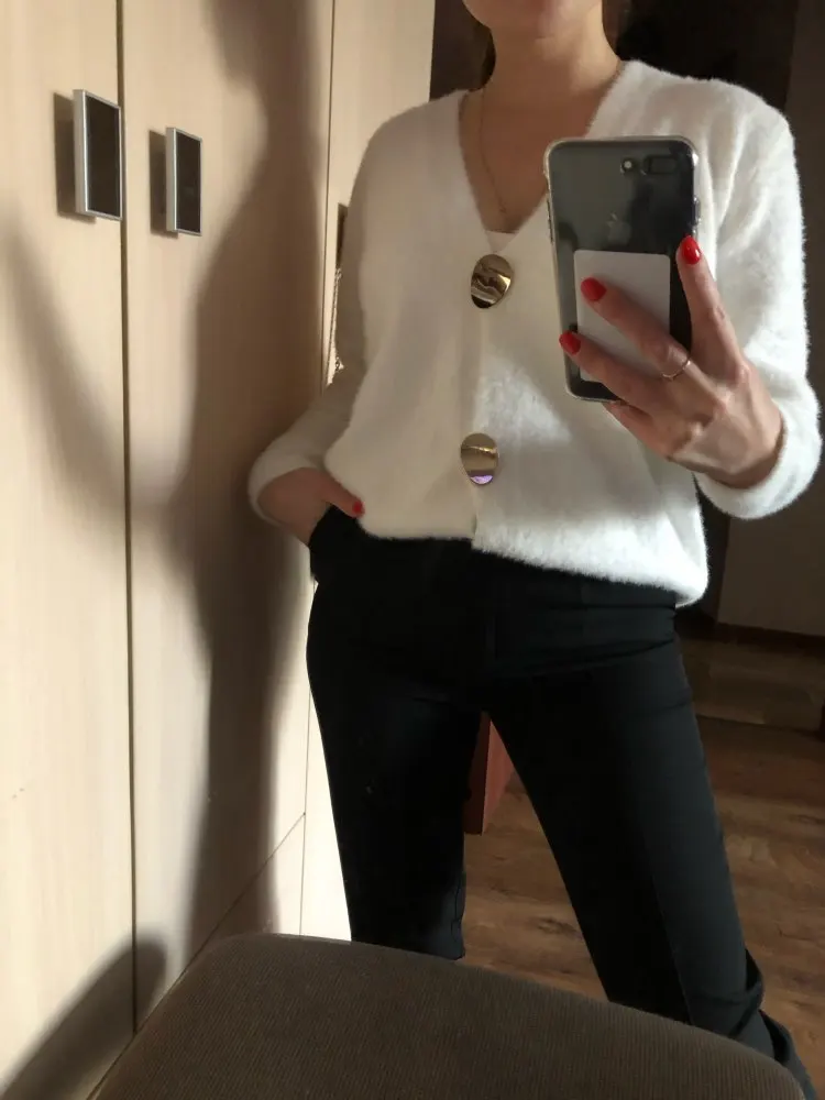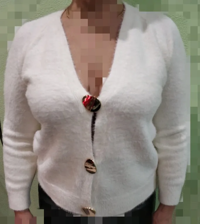 кофта бомба! очень мягкая, приятная к телу, пушистая. на российский 44,рост 163см села отлично. вырез довольно глубокий получается, но мне нравится. пуговицы тяжелые, красивые. в целом смотрится очень дорого, довольна очень