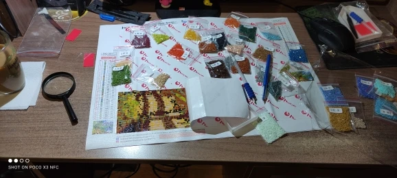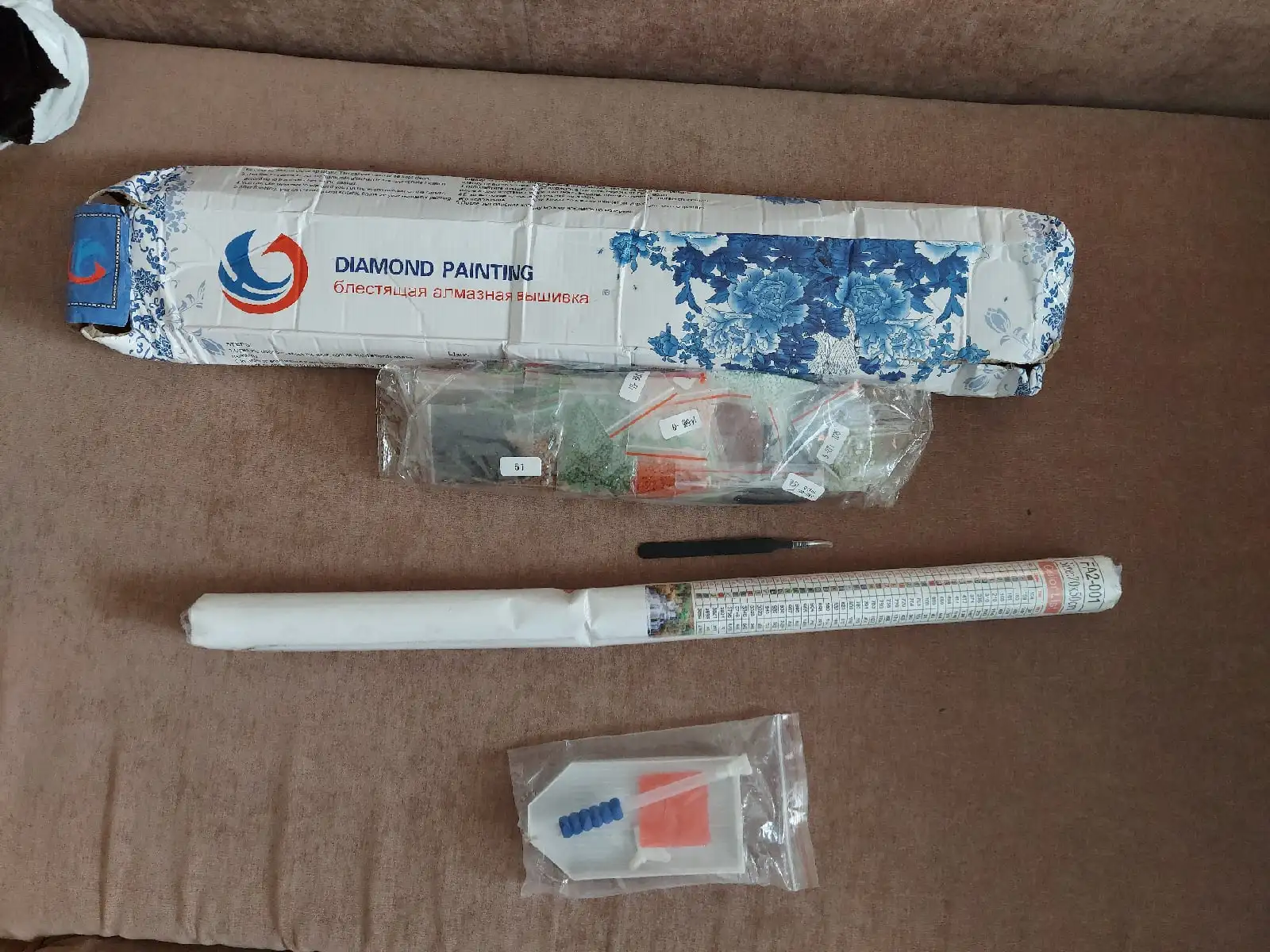 посылка пришла без задержек, полностью отслеживалась. картина с полным заполнением, хорошо упакована. защитная пленка плотно прилегает. хороший пинцет в наборе. хороший продавец.