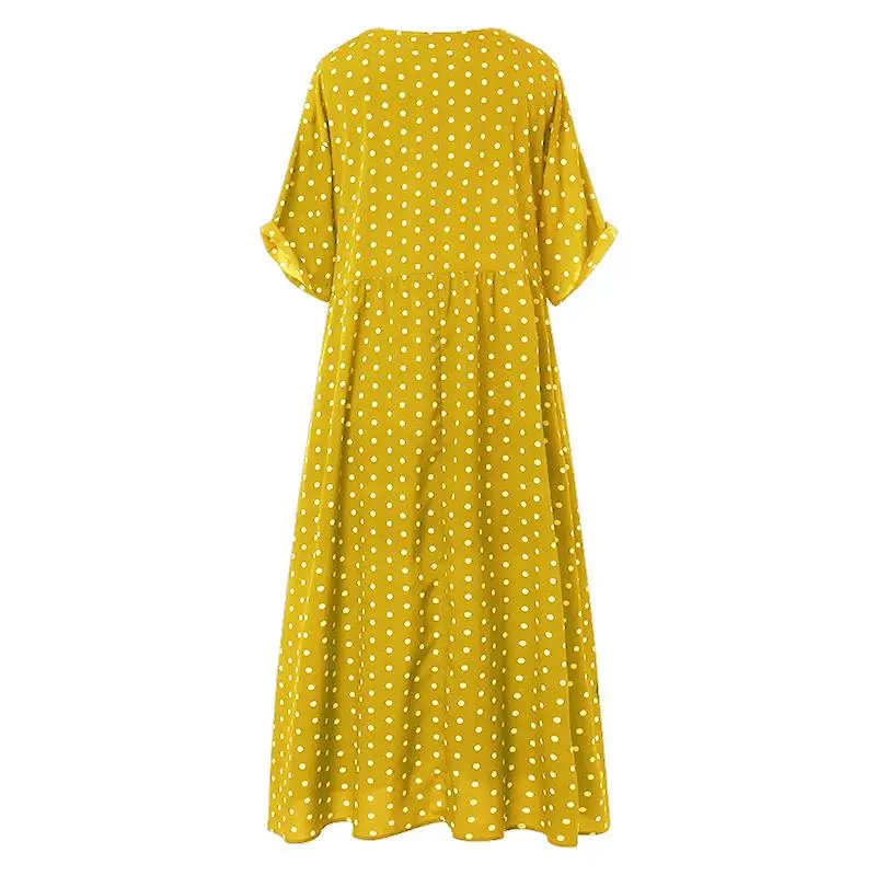 Материал: 100% полиэстерТип: ПлатьеЦвет: черный, темно-синий, розовый, желтый, зеленыйПосылка входит: 1 платьеДетали продукта:-Короткий рукав-О-образный вырез-Многоцветный-Простой и удобный-Боковые карманы-Длина по щиколотку-Платье в горошек