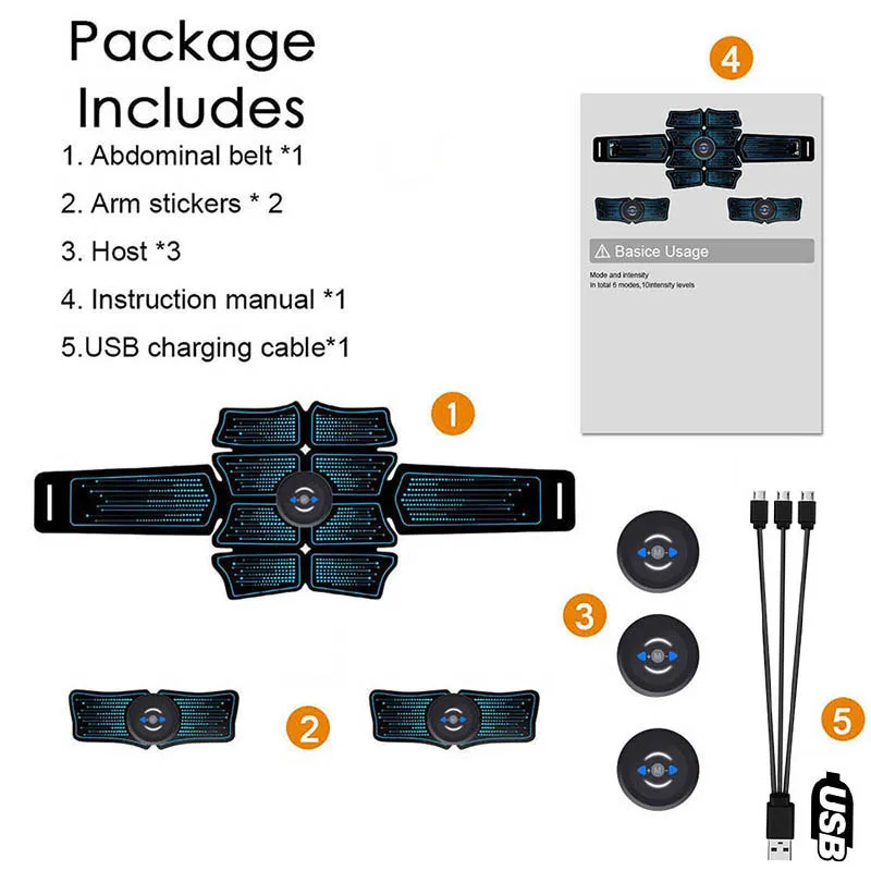 1 x брюшный пояс2 x ремни для рук3 x контроллер1 х USB кабель для зарядки1 x Руководство пользователя