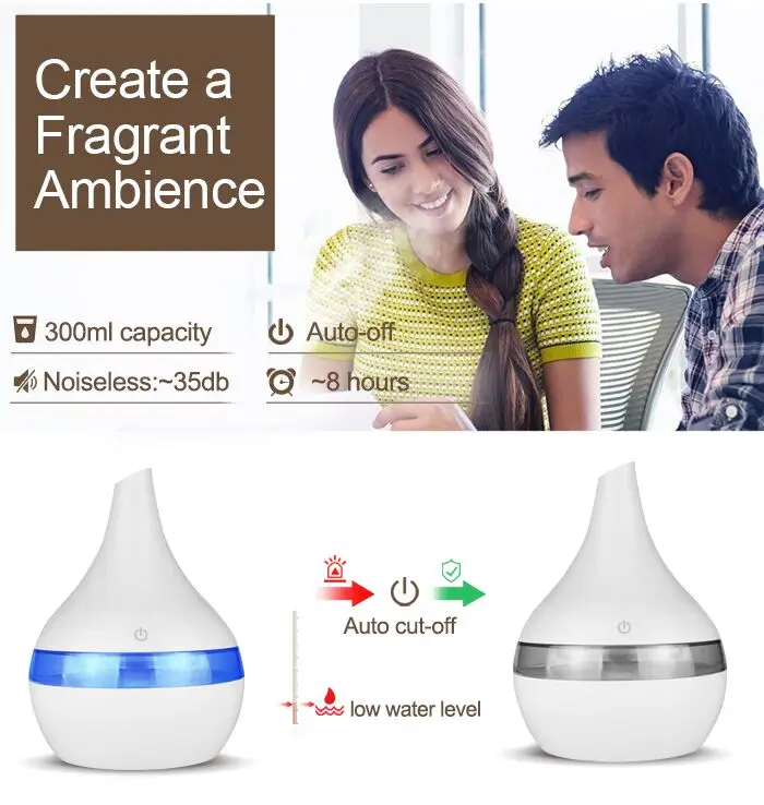 Электрический ультразвуковой увлажнитель воздуха, 300 мл, USB, аромадиффузор, эфирное масло, ароматерапия, дерево, холодный туман, светодиодный светильник для дома