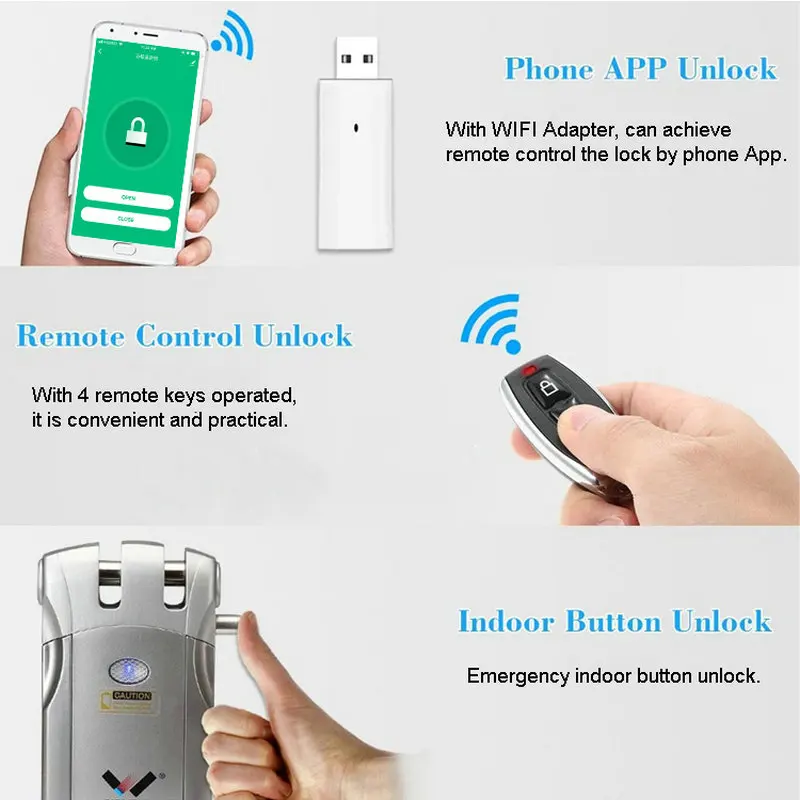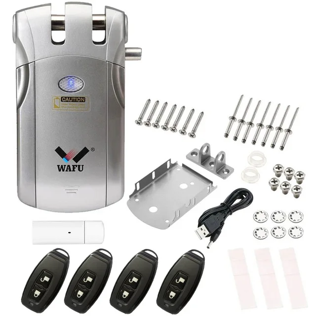 . Особенности: * Нет дизайна отверстия для замка, он полностью отказывается от традиционного ключа и замка, открывается и закрывается с помощью пульта дистанционного управления или приложения для телефона, реализована реальная безопасность. * Метод блокировки тигра, более безопасный и стабильный. Нет замочных отверстий снаружи, нет способа для воров. * Добавьте функцию внешнего источника питания USB. Убедитесь, что блокировка работает, когда батарея была мертва. (батарея в комплект не входит) * Три режима разблокировки опционально: разблокировка приложения для телефона, разблокировка с помощью пульта дистанционного управления, кнопка аварийной разблокировки в помещении. * Простая установка на все виды дверей, очень удобная.