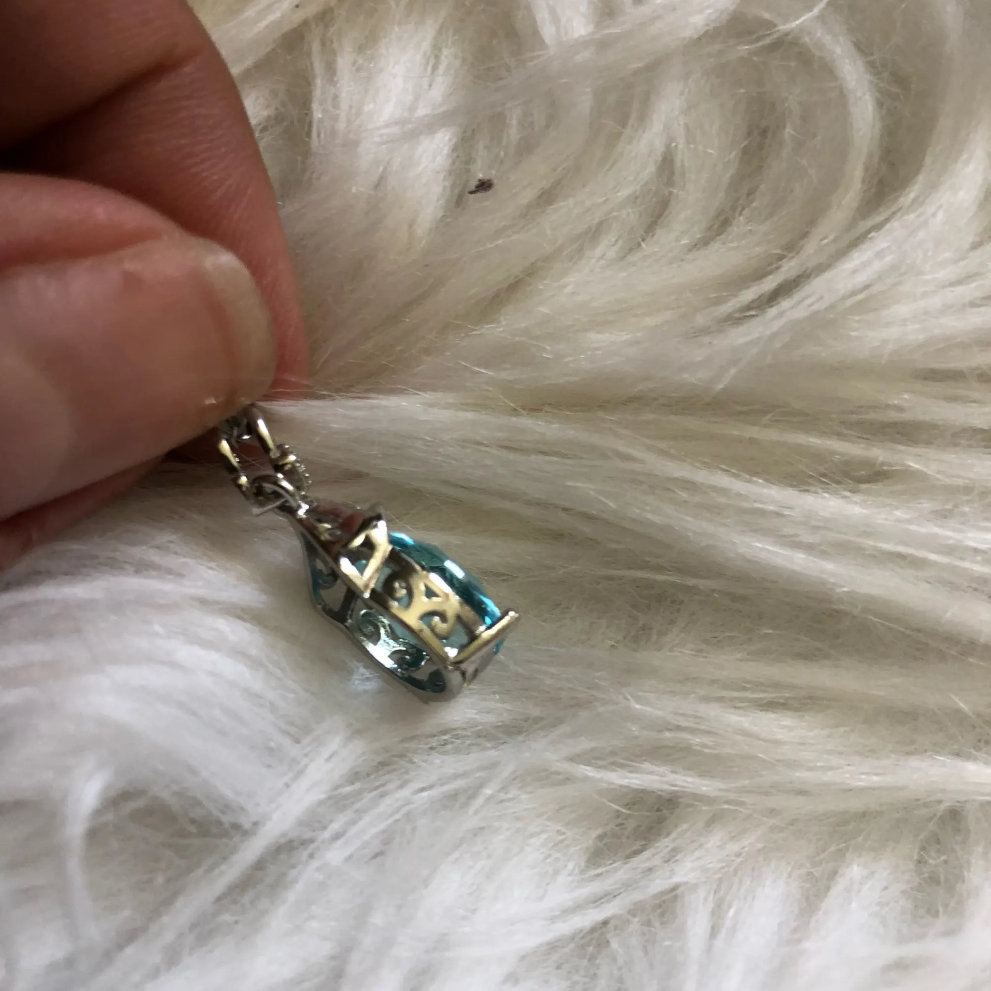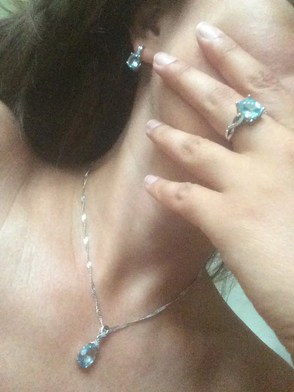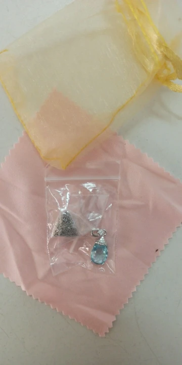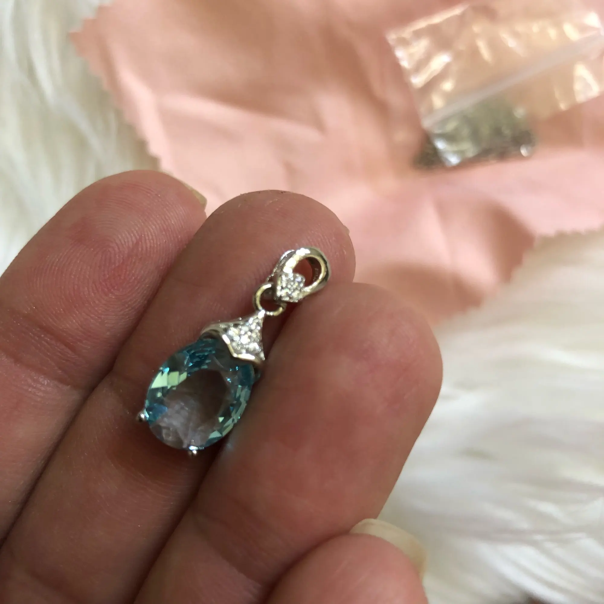 Сияет) от серебра на первый взгляд не отличить - ношу на серебряной цепочке. Врядли аквамарин, конечно. Максимум фианит, а то и просто ювелирный кристалл. Но своих денег стоит. Под мои маленькие серёжки с выращенным топазом скай хорошо подошла подвеска.