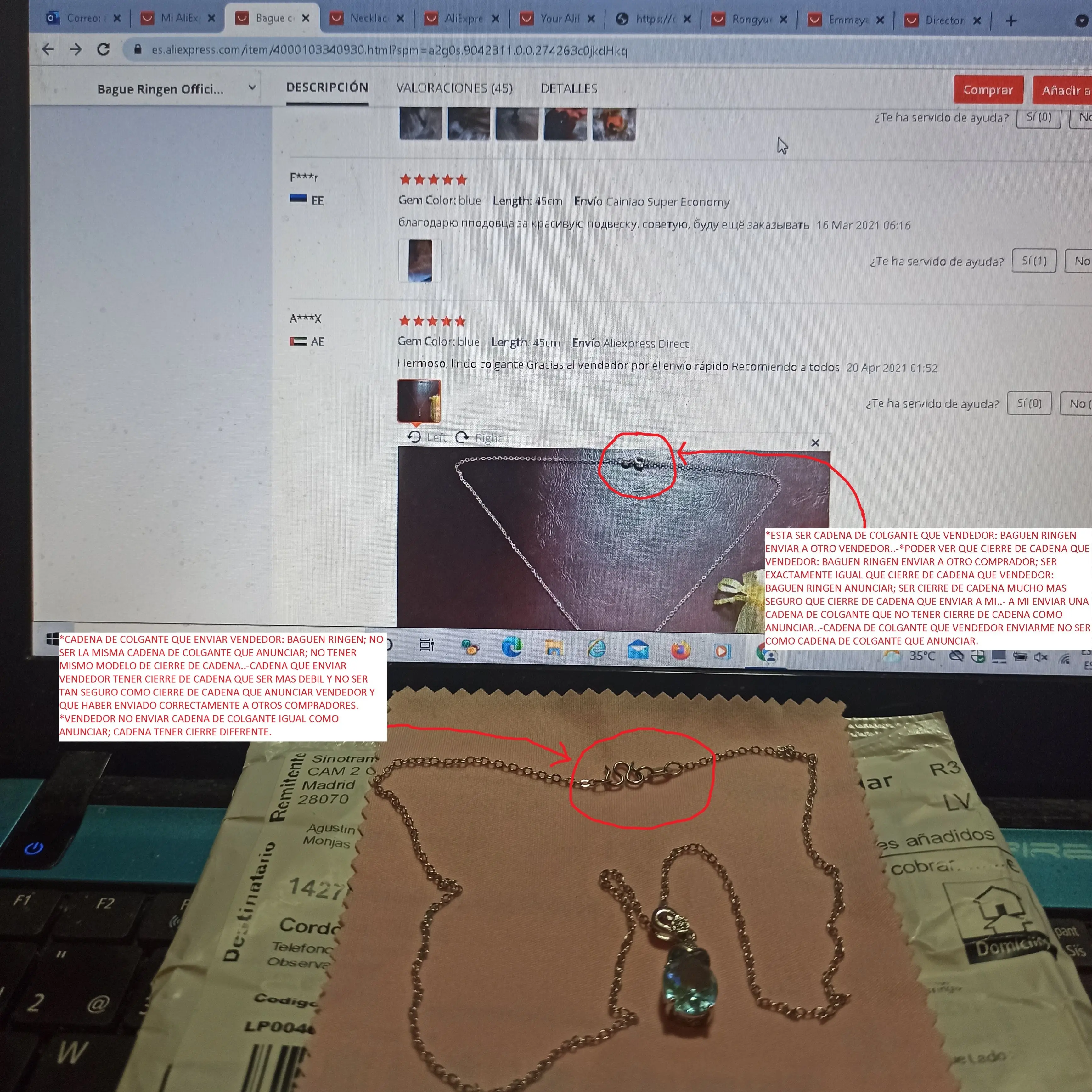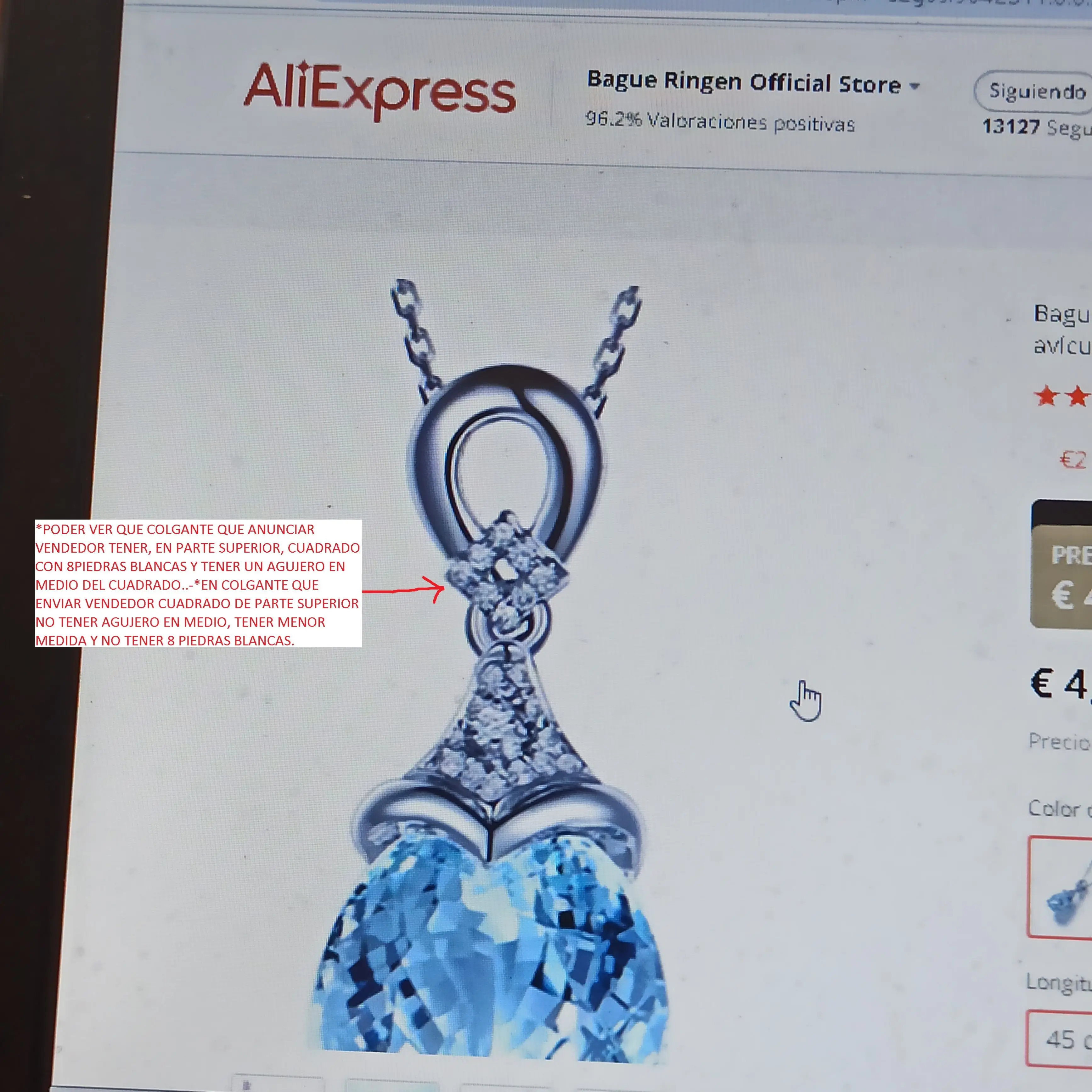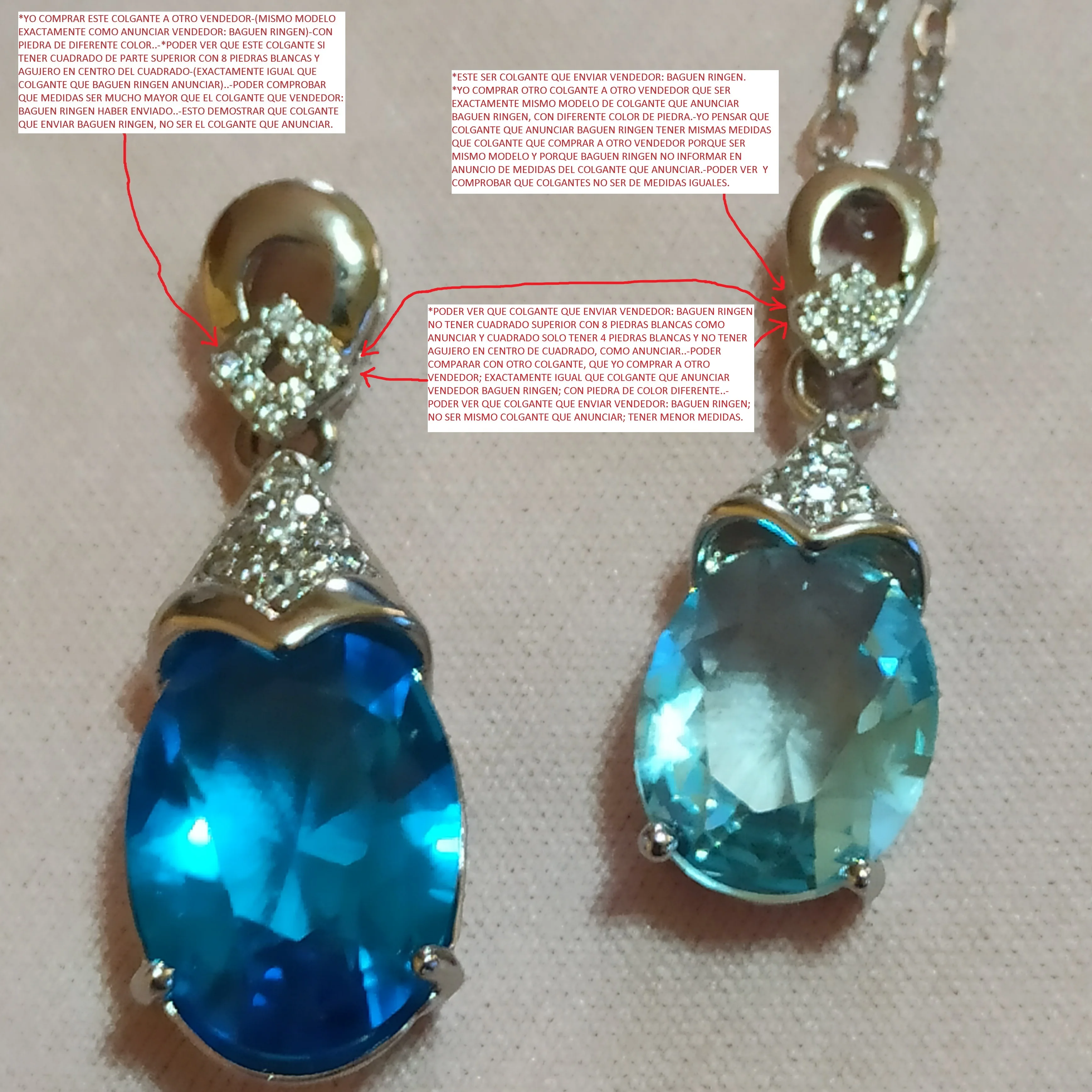 -Продавец отправляет подвеску, которая имеет меньший размер, чем рекламируется, Я купил точно такой же кулон у другого продавца с другим цветом камня и иметь больше размеров, чем кулон, чем отправить этого продавца (можно увидеть на фотографиях) .. Подвеска, которую продавец отправляет, имеет различия-подвеска, которую он рекламирует, В верхнем квадратном орнаменте они имеют 8 белых камней и имеют отверстие в центре квадрата; В подвеске, которая отправляет квадратный продавец, они имеют только 4 белых камня и не имеют отверстия в центре квадрата; квадрат имеет меньшие измерения... также цепочка подвески, которая отправляет этого продавца, не иметь одинаковую цепочку закрытия; Какая цепочка, которая объявляет, что закрытие более безопасно... также подвеска, которая посылает, имеет меньший вес, чем рекламирует продавец... не посылает то же самое подвеску или ту же цепочку.
