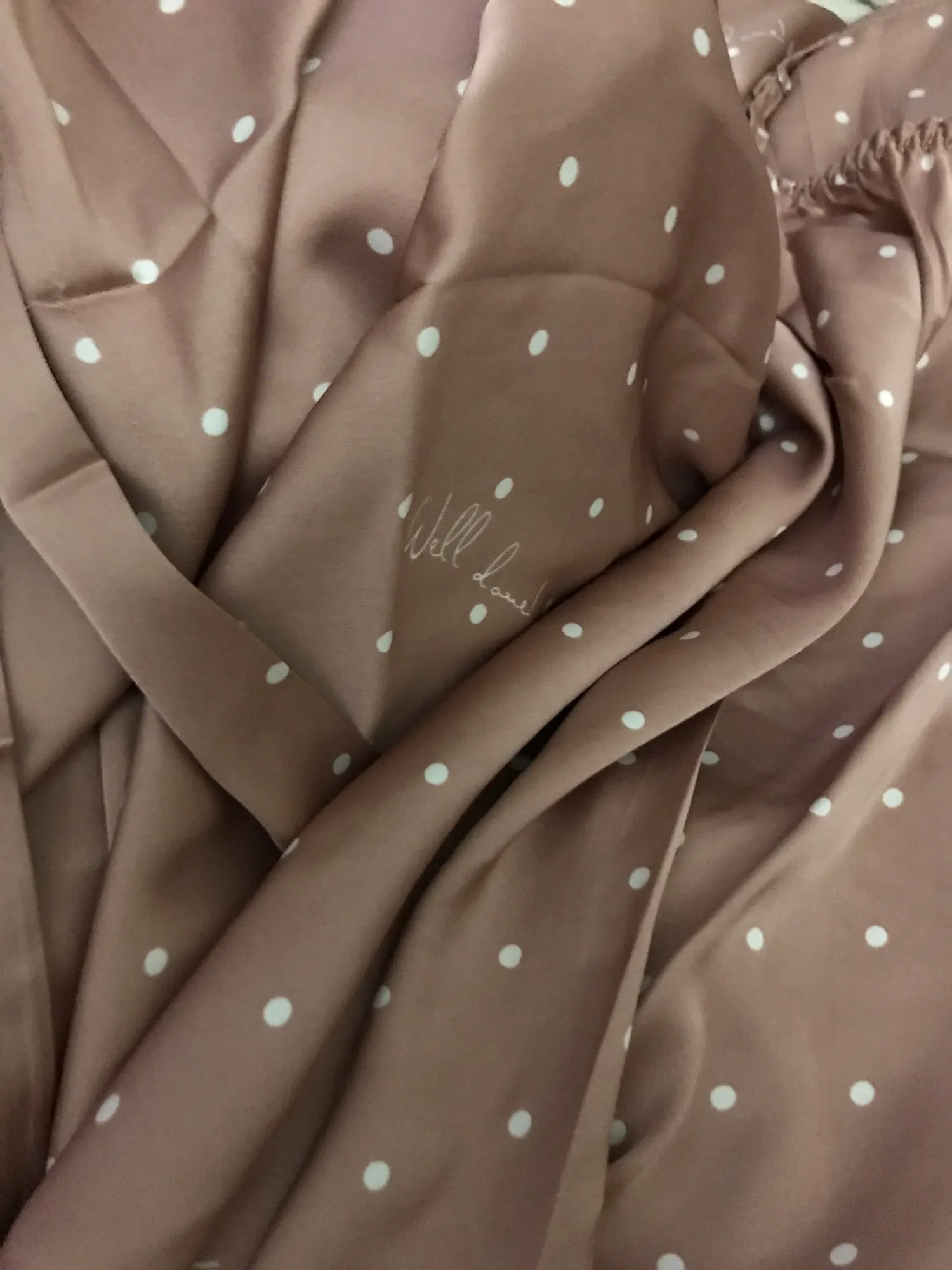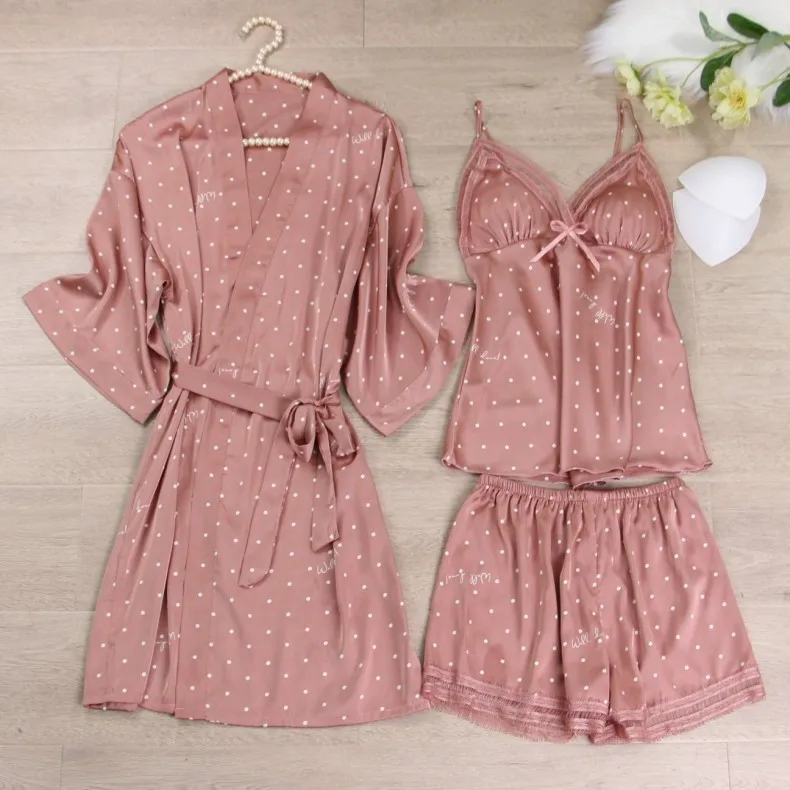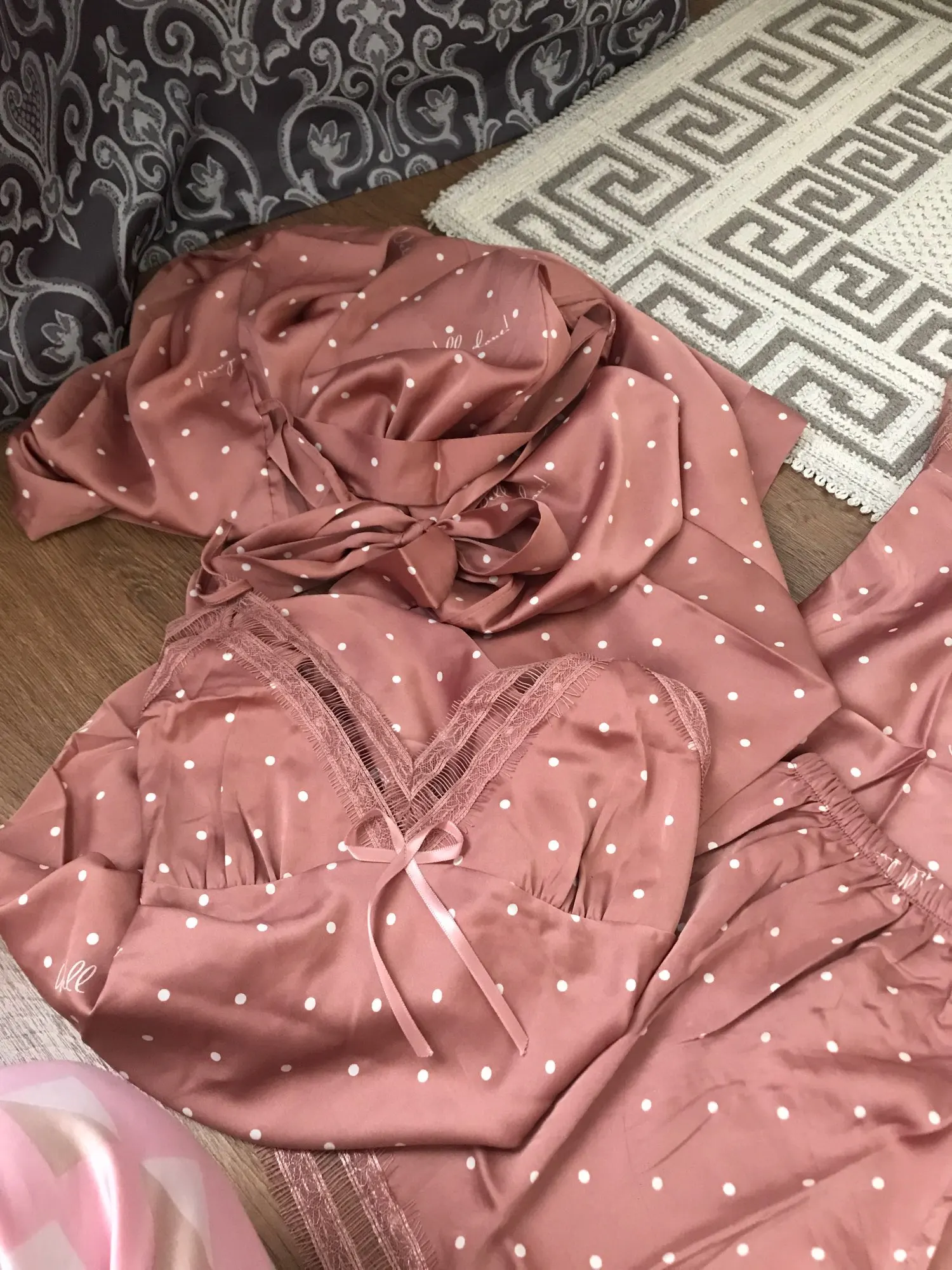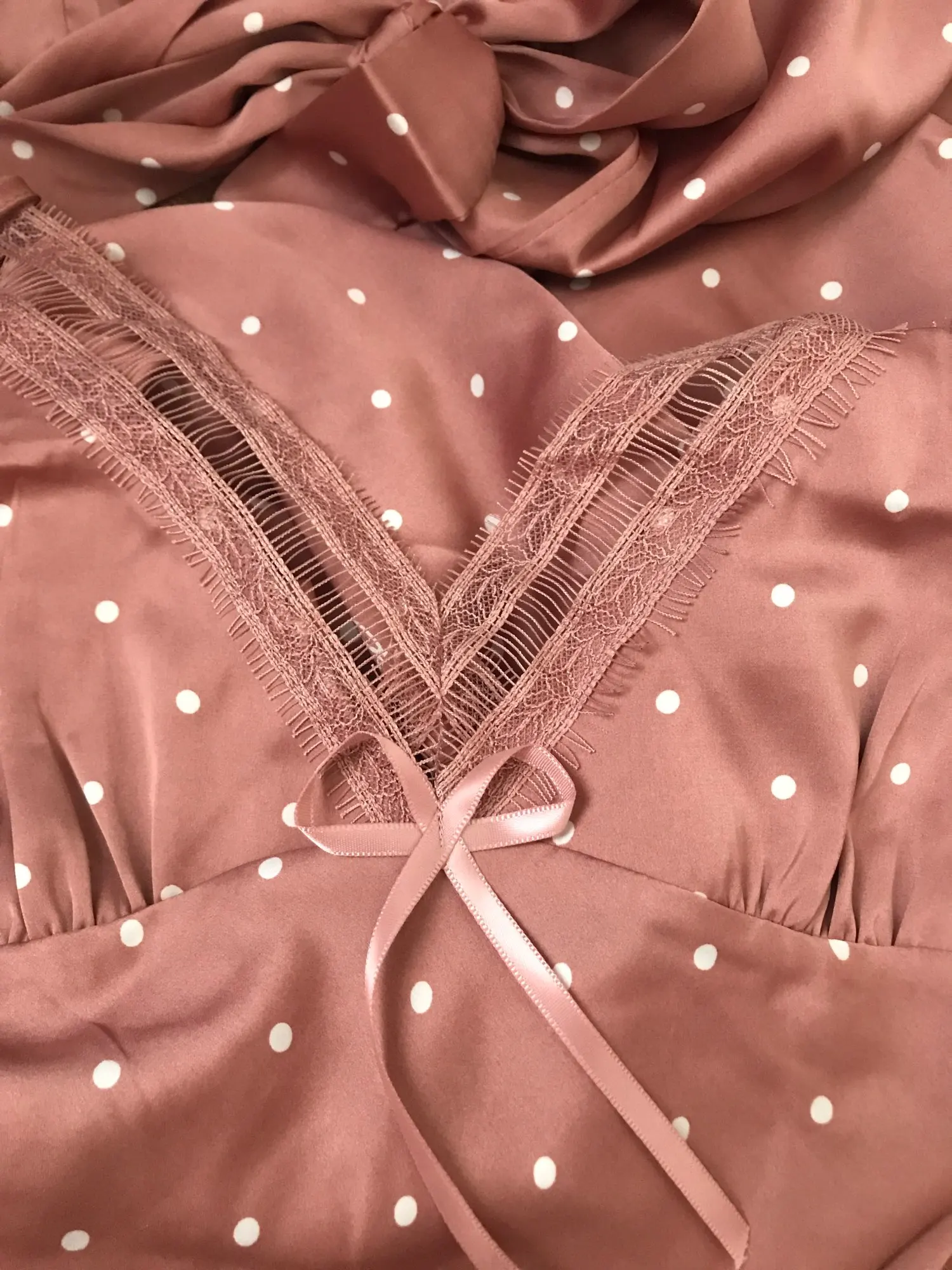 Комплект ночной рубашки и кимоно, в розовый горошек