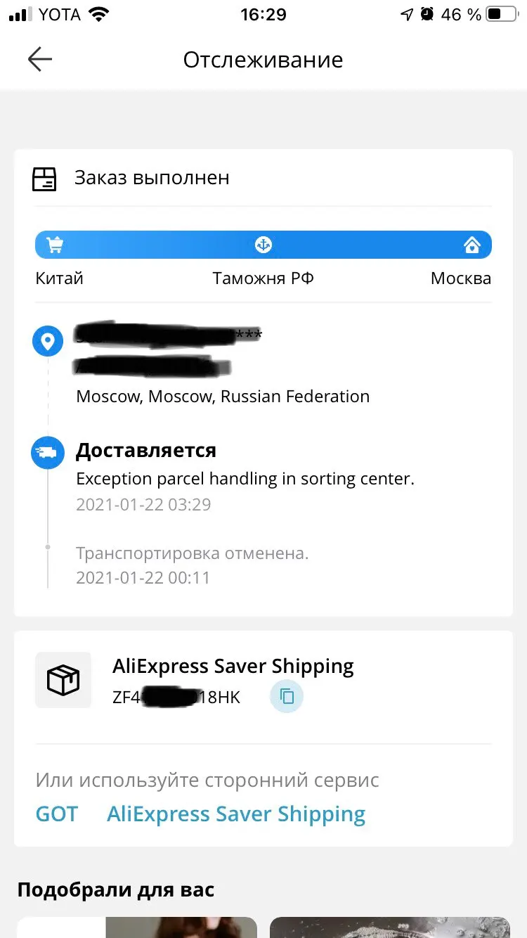 Заказ после отправки завис со статусом «транспортировка отменена», продавец сначала отмазывался, потом вообще перестал отвечать. Али вернули деньги через спор - вечером открыла, утром деньги вернулись. Это мой второй заказ у продавца, в первый раз все норм было. Крайне обескуражена произошедшим.