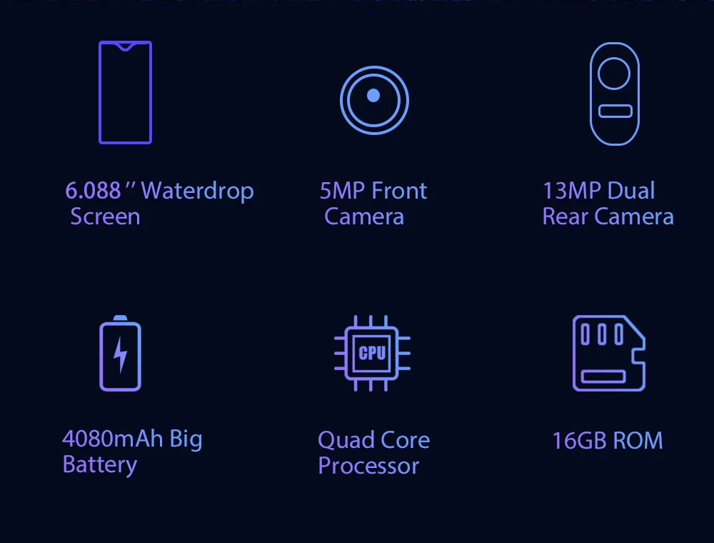 1. Четырехъядерный процессор MTK6580A до 1,3 ГГц, хорошая производительность, в сочетании с 2 Гб + 16 ГБ, работает быстро и работает гладко.2. 6,088 дюймовый IVO IPS экран, разрешение 1280*600, 19,2: 9, полный угол, маленький корпус, большой экран обзора, Мультитач.3. 13MP OV8858 AF основная + Ложные вторичные задние двойные камеры, запечатлевают замечательные моменты, снимают резкие и четкие снимки.4. Питание от литий-ионного полимерного аккумулятора 4080 мАч 4,4 в, длительный срок службы.Сеть1. 2G Частота сети:-GSM 850/900/1800/1900 МГц2. Частота сети 3G:-WCDMA B1/B2/B5/B8