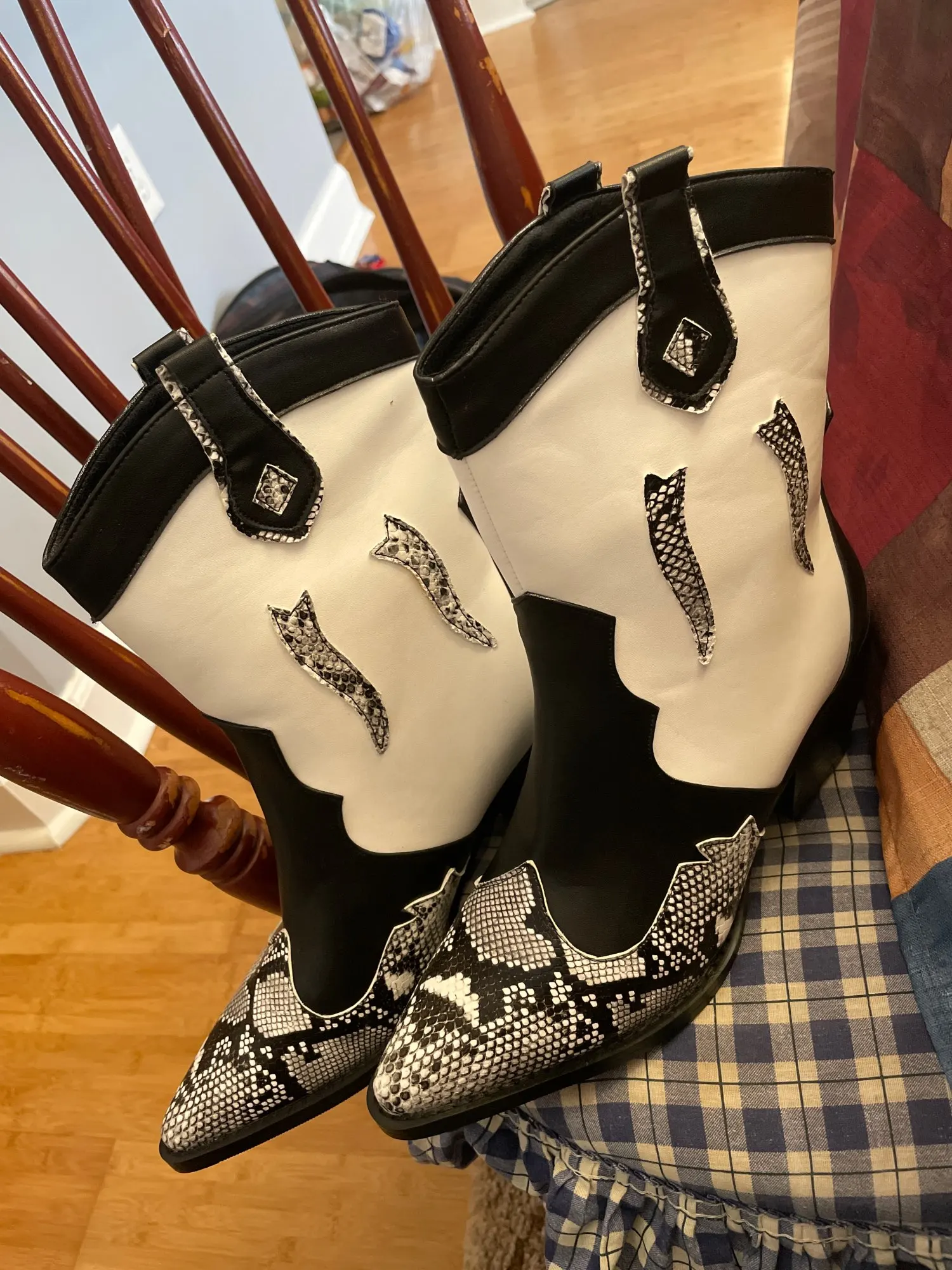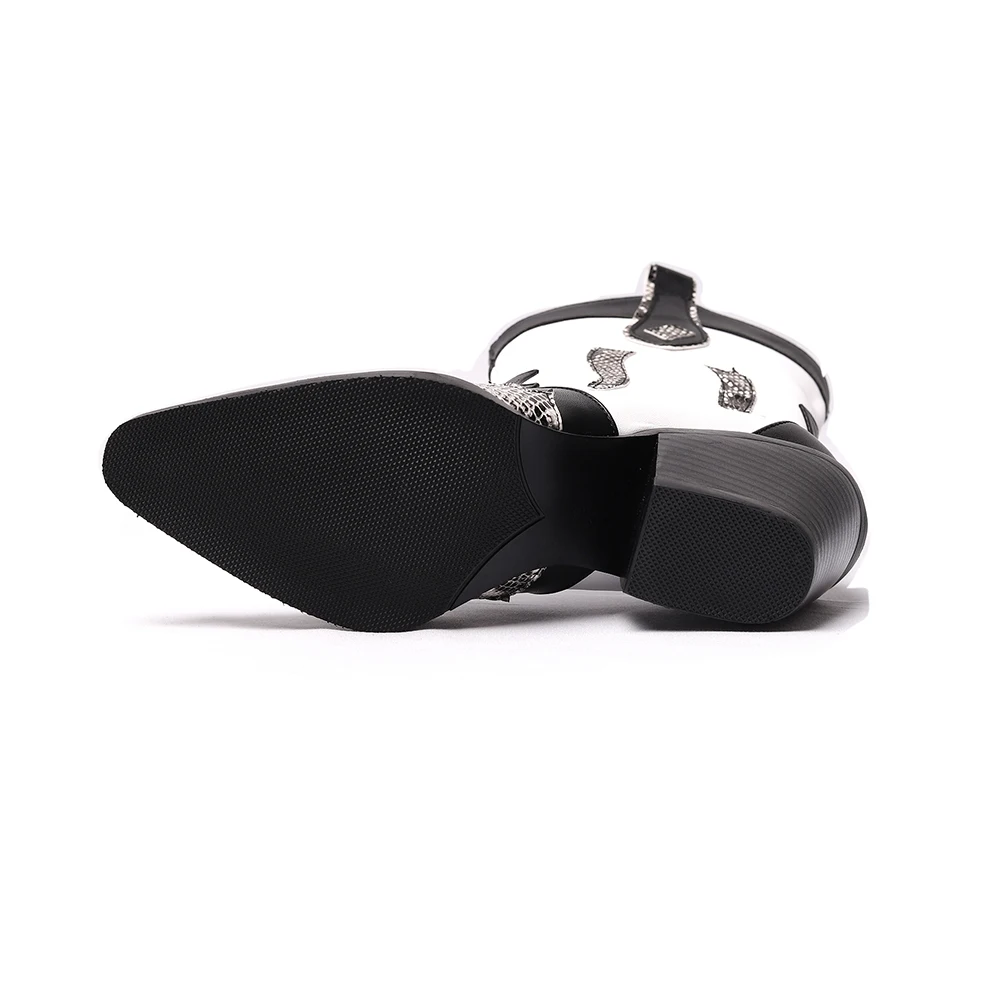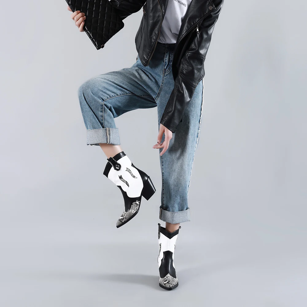 Казаки смешанных цветов из искусственной кожи, ковбойские ботинки, женские ботинки на танкетке, на высоком каблуке, со змеиным принтом, ковбойские женские ботинки, женские