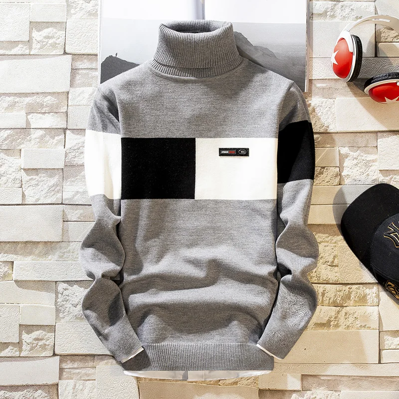 Свитер мужской с высоким воротом, трикотажный облегающий пуловер, однотонный, M-3XL, на осень